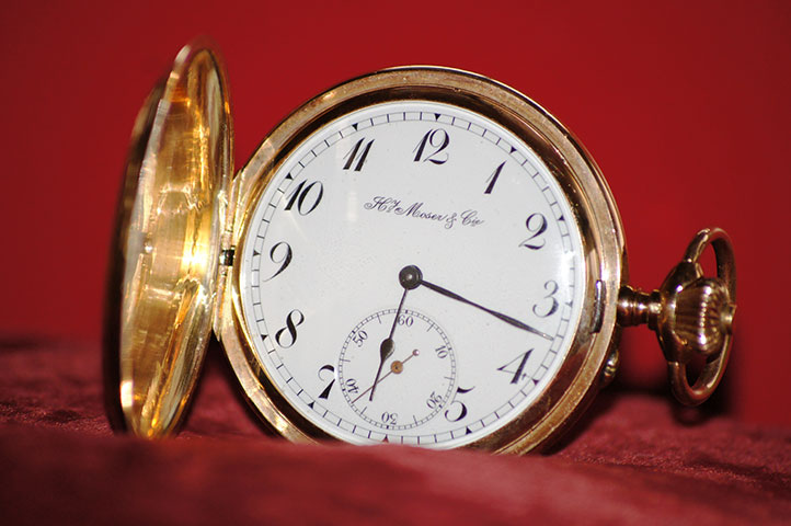 Фирма Н. Moser & Cie. Карманные часы в золотом корпусе с золотой цепью. На всех деталях из золота отчеканена проба 14К56, круглые, идеальных пропорций. Они не слишком велики и не слишком малы. Вес часов 92 грамма и цепь 30 грамм. Ориентировочное время изготовления часов 1900-1910 г.г. На часах имеется номер №132238. Четко показывают часы, минуты и секунды (фактическая точность хода не более 1 сек в сутки). 3 крышки и 19 видимых оттисков проб и другой идентификации.Часы в отличном состоянии. Корпус - 52 мм в диаметре, длина цепочки - 30 см.