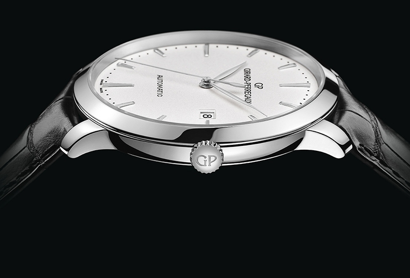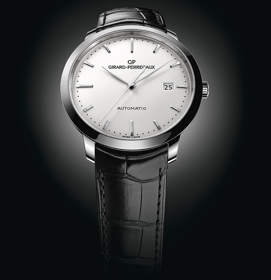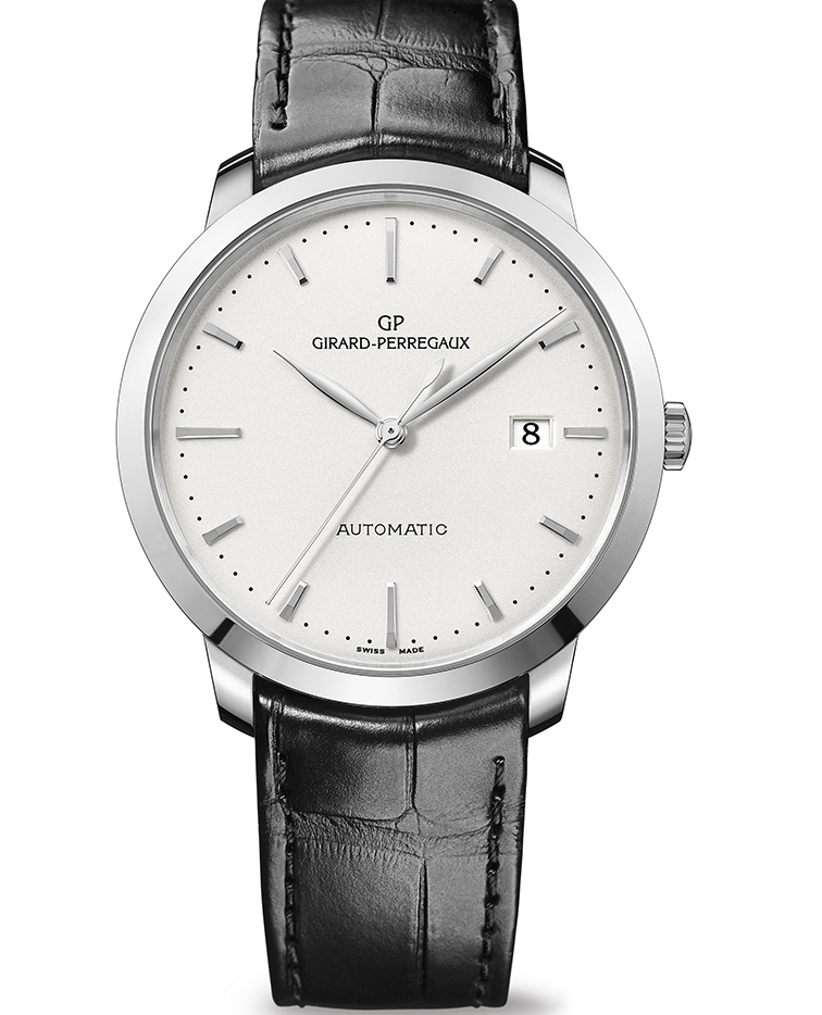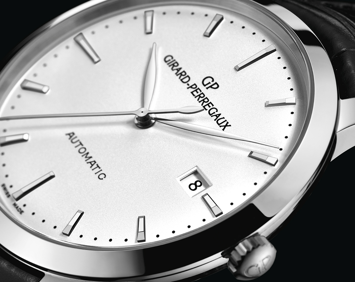 Круглый полированный корпус новинки изготовлен из нержавеющей стали, диаметром 40,0 мм, толщиной 8,9 мм, водонепроницаемый до 30 метров. На торце рифленой заводной головки, расположенной на 3 часах, выгравирован логотип бренда Girard-Perregaux. Сапфировое стекло с антибликовым покрытием установлено на передней стороне корпуса (выпуклое) и на его задней крышке. Циферблат серебристого цвета, с накладными продолговатыми гранеными часовыми индексами, часовой и минутной стрелками, выполненными в листьевидной форме.