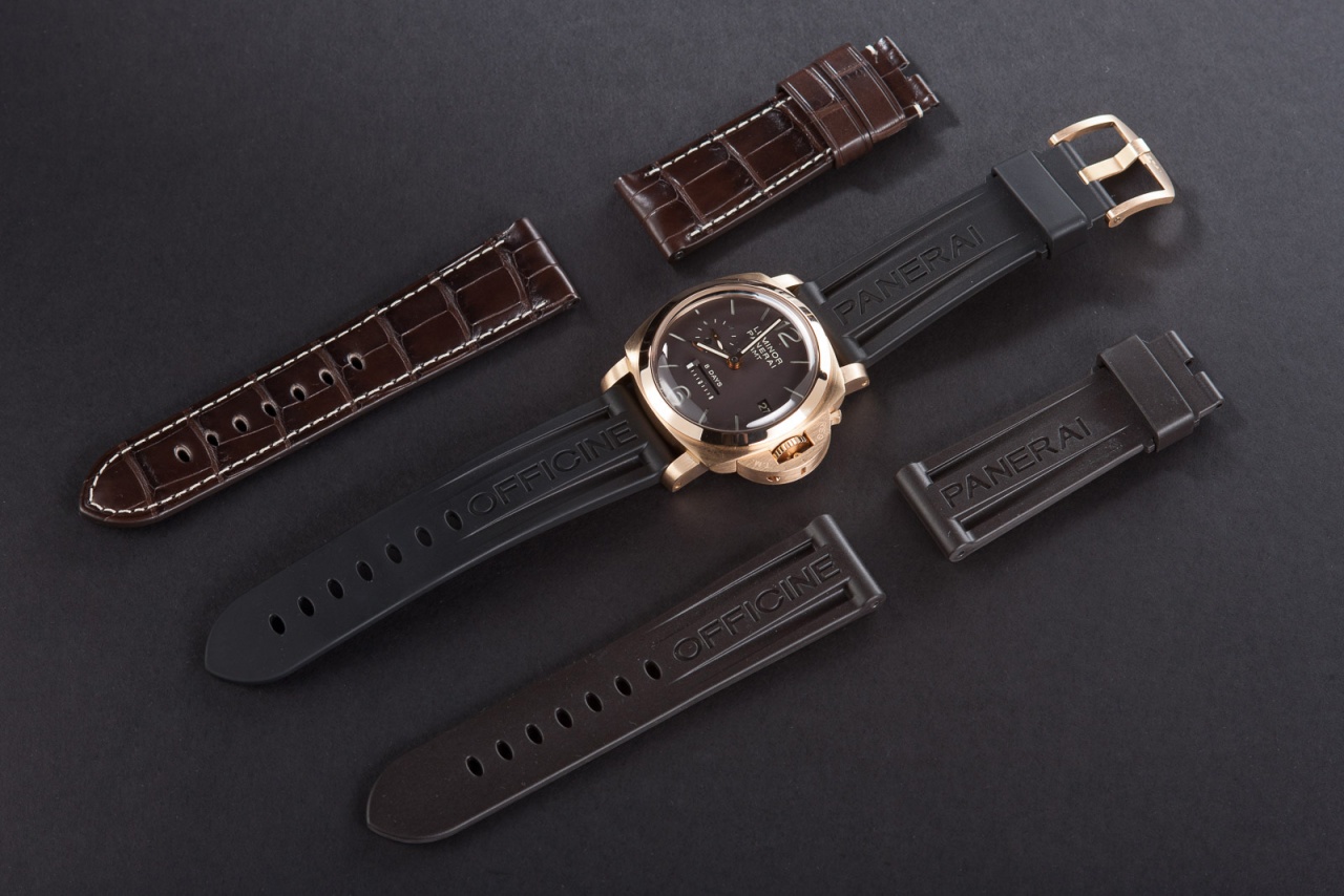 Фирменный ремешок PANERAI из крокодиловой кожи с пряжкой из матового розового золота 18 карат.