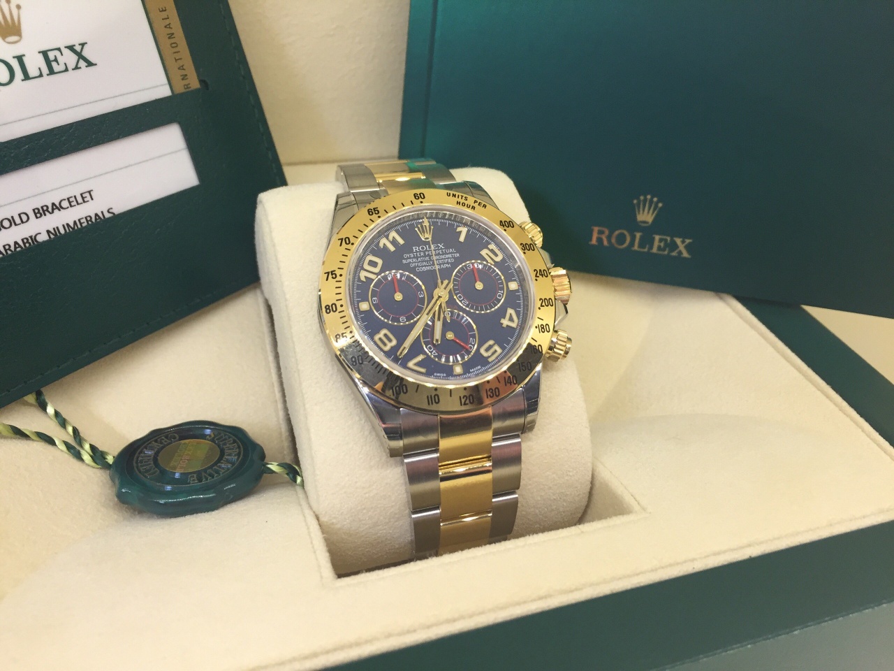 Корпус Oyster, 40 мм, сталь и желтое золото, Конструкция Oyster Цельный корпус, привинчиваемые крышка и заводная головка, Диаметр 40 мм, Материал Желтый Rolesor (сочетание стали 904L и 18-каратного желтого золота), Безель Фиксированный, с выгравированной тахиметрической шкалой, из 18-каратного желтого золота, Заводная головка Привинчиваемая, с системой тройной герметизации Triplock, Стекло Сапфировое, устойчивое к появлению царапин, Водонепроницаемость До 100 м, Механизм Perpetual, механический хронограф, автоматический подзавод, Калибр 4130, производство Rolex, Функции Центральные часовая, минутная и секундная стрелки, маленькая секундная стрелка в положении «6 часов». Хронограф с центральной стрелкой с точностью до 1/8 секунды, 30-минутный счетчик в положении «3 часа», 12-часовой счетчик в положении «9 часов». Возможность остановки секундной стрелки для выставления точного времени, Точность Сертификат COSC, Осциллятор Синяя парамагнитная спираль Parachrom, Завод часов Автоматический подзавод в двух направлениях с помощью ротора Perpetual, Браслет Oyster, плоские трехрядные звенья, Материал браслета Желтый Rolesor (сочетание стали 904L и 18-каратного желтого золота), Застежка безопасности Oysterlock с раскладывающейся пряжкой и удлиняющим до 5 мм звеном Easylink, Циферблат Синий, Детали Секундный счетчик со спиралевидным мотивом.