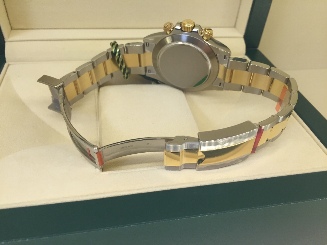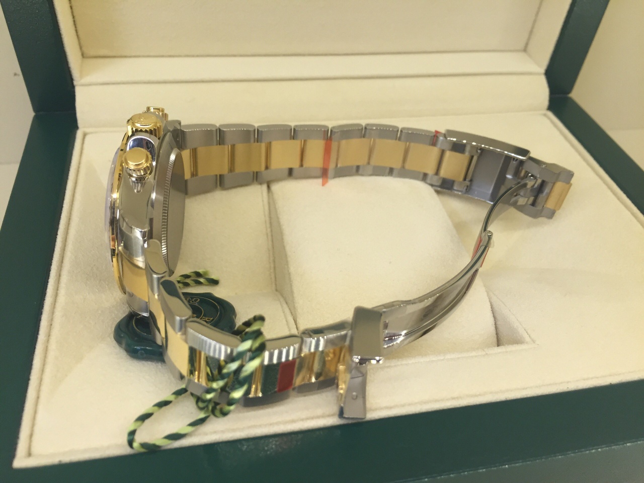 Корпус Oyster, 40 мм, сталь и желтое золото, Конструкция Oyster Цельный корпус, привинчиваемые крышка и заводная головка, Диаметр 40 мм, Материал Желтый Rolesor (сочетание стали 904L и 18-каратного желтого золота), Безель Фиксированный, с выгравированной тахиметрической шкалой, из 18-каратного желтого золота, Заводная головка Привинчиваемая, с системой тройной герметизации Triplock, Стекло Сапфировое, устойчивое к появлению царапин, Водонепроницаемость До 100 м, Механизм Perpetual, механический хронограф, автоматический подзавод, Калибр 4130, производство Rolex, Функции Центральные часовая, минутная и секундная стрелки, маленькая секундная стрелка в положении «6 часов». Хронограф с центральной стрелкой с точностью до 1/8 секунды, 30-минутный счетчик в положении «3 часа», 12-часовой счетчик в положении «9 часов». Возможность остановки секундной стрелки для выставления точного времени, Точность Сертификат COSC, Осциллятор Синяя парамагнитная спираль Parachrom, Завод часов Автоматический подзавод в двух направлениях с помощью ротора Perpetual, Браслет Oyster, плоские трехрядные звенья, Материал браслета Желтый Rolesor (сочетание стали 904L и 18-каратного желтого золота), Застежка безопасности Oysterlock с раскладывающейся пряжкой и удлиняющим до 5 мм звеном Easylink, Циферблат Чёрный, Детали Секундный счетчик со спиралевидным мотивом.