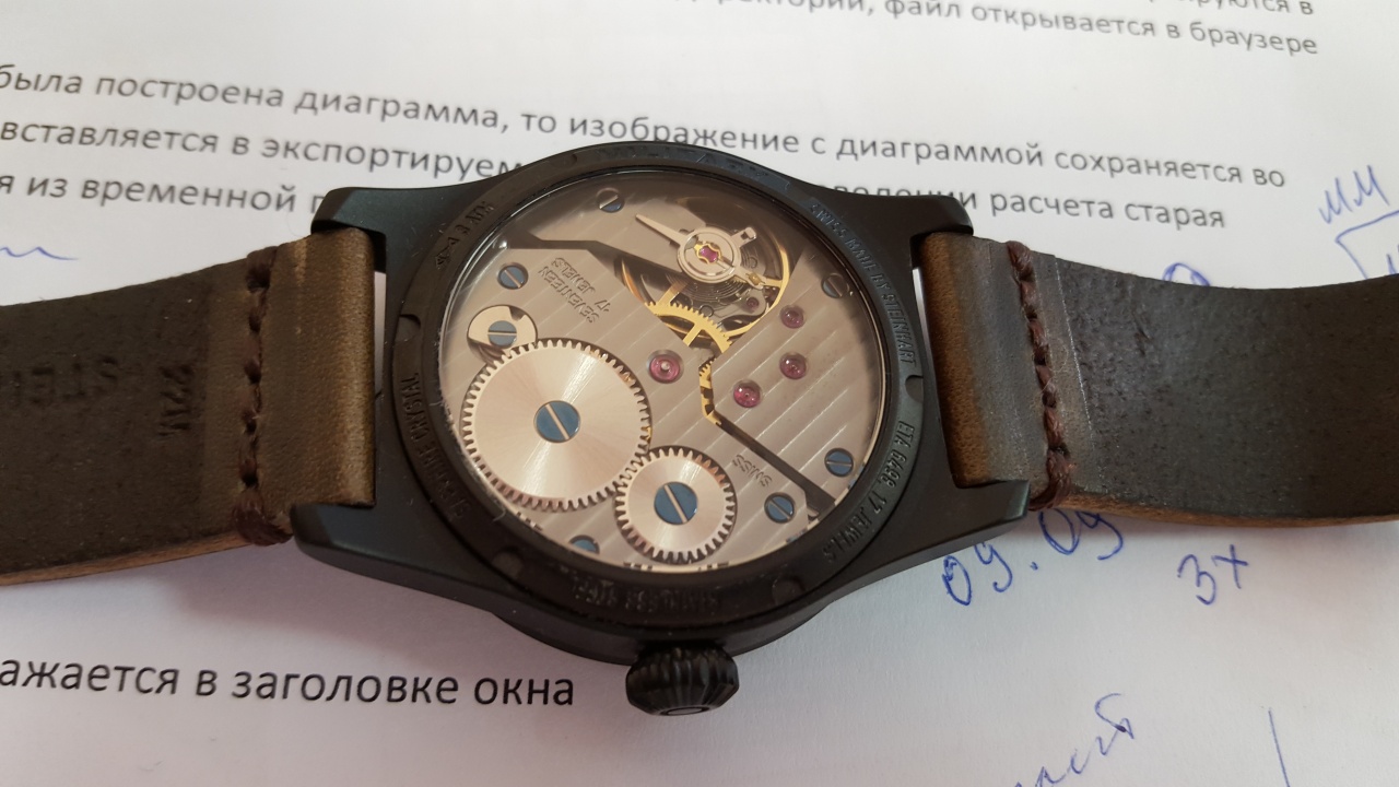 Механизм: ЕТА 6498-1 Unitas, 17 камней, 18000 полуколебаний в час, ручной завод, с платинами графитового цвета