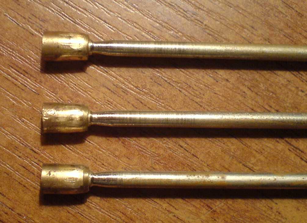 После этого круглым и плоским надфилями за пяток минут на стержнях были запилены шейки диаметром 1,8-2,0 мм (непринципиально) и выполнены конусочки длиной на ширину надфиля - около 6-8 мм (непринципиально).