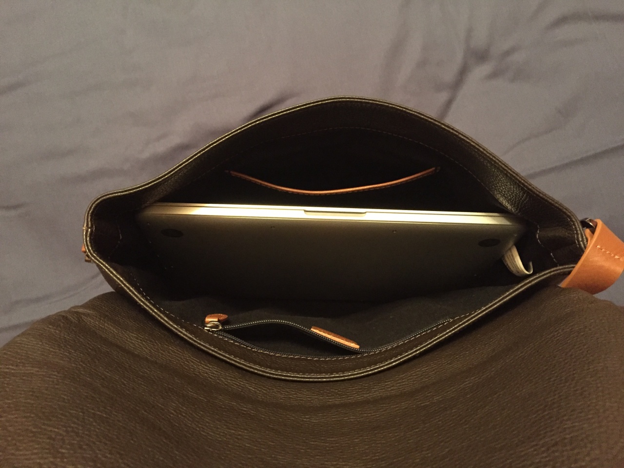 Основная часть сумки из зернистой кожи темно-шоколадного цвета.