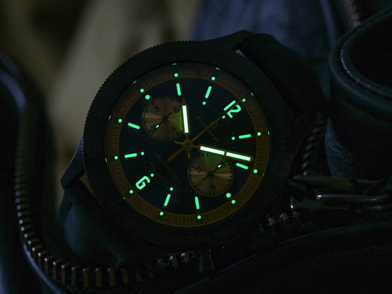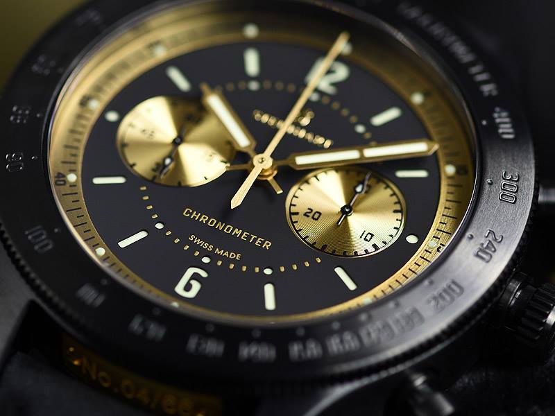 Новинка имеет круглый корпус, изготовленный из нержавеющей стали с черным DLC-покрытием, диаметром 48,0 мм, с ограниченной водозащитой, 22-миллиметровым расстоянием между дужками. На фиксированном безеле выгравирована тахиметрическая шкала. Рифленая заводная головка расположена на 3 часах, пушеры хронографа - на 2 и 4 часах. Сапфировое стекло установлено на передней стороне корпуса (с внутренним антибликовым покрытием) и на его завинчивающейся задней крышке. Циферблат матово-черного цвета, выполнен в стиле "сэндвич" с использованием люминесцентного состава SuperLumiNova. Этот же состав нанесен на часовую и минутную стрелки.