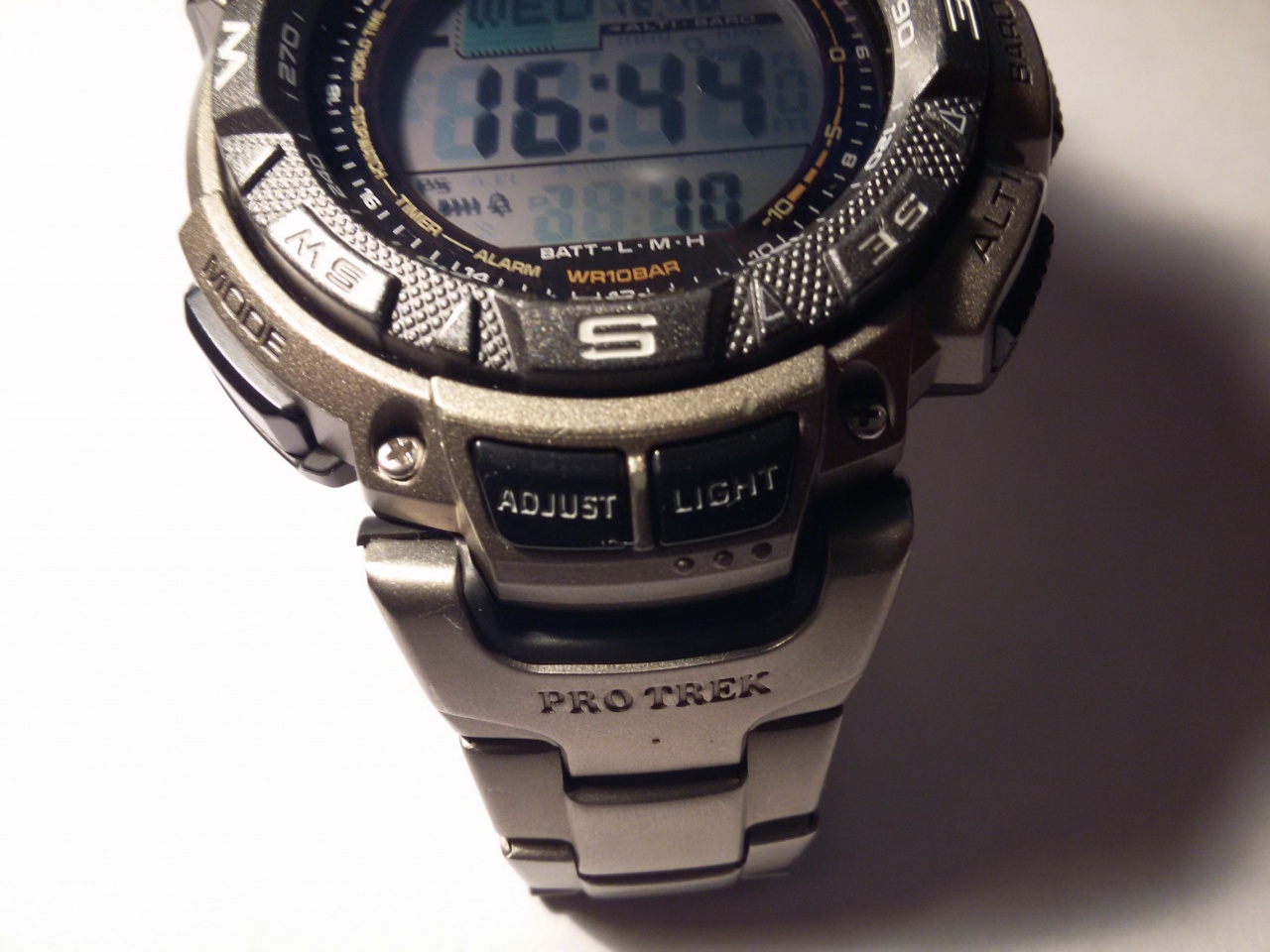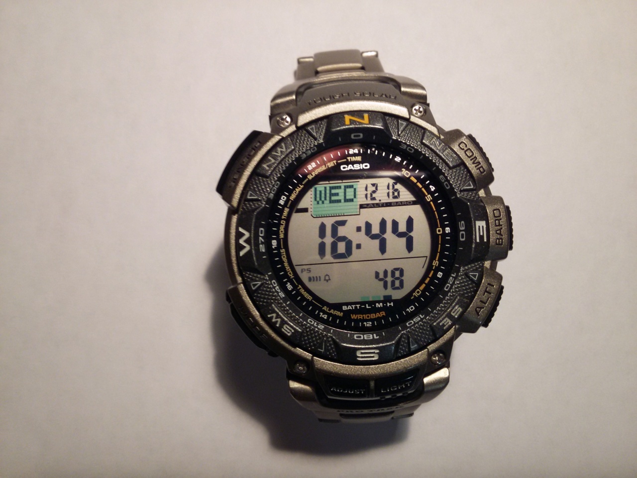 Описание: Многофункциональные наручные часы с барометром, альтиметром, датчиком температуры и компасом для активного отдыха. Точность хода: не хуже +/-15 секунд в месяц. Полностью автоматическая электролюминесцентная подсветка с автоматической активацией при и тусклом, неясном свете и выключением подсветки при достаточном освещении. Встроенный цифровой компас. Альтиметр: встроенный датчик барометрического давления с возможностью вывода результатов в единицах высоты над уровнем моря. Максимальная высота - 10000 метров над уровнем моря. Барометр: встроенный датчик давления для измерения барометрического давления. встроенный датчик температуры. подзарядка аккумулятора от энергии солнечного света. двойной жк-дисплей. отображение текущего времени в основных городах и регионах мира. Функция отображения времени восхода и захода солнца, на основании введенных данных о широте и долготе в точке местонахождения. Секундомер с точностью показаний 1/100 сек и максимальным временем измерения - 24 час. Таймер обратного отсчета. 5 ежедневных будильников. индикатор уровня зарядки элемента питания. автоматический календарь. функция выключения звука. поворотный лимб с высеченными направлениями сторон света. Модуль часов рассчитан на работу при низких температурах. Минеральное стекло устойчивое к возникновению царапин. Титановый браслет. Браслетный замок с тройным сгибом, расстегиваемый одним касанием. Размеры корпуса 50.9x57.3x15.3 мм