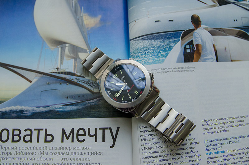 люминесцентными стрелками и часовыми метками, закрыт выпуклым сапфировым стеклом.