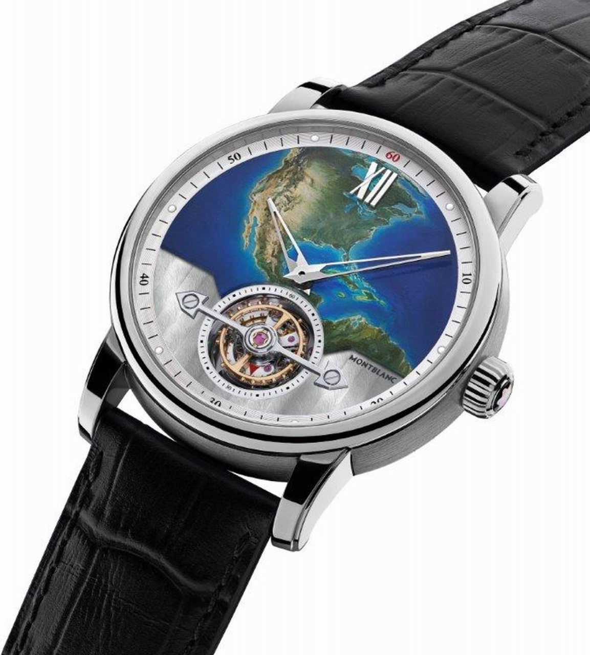 Новая лимитированная модель 4810 ExoTourbillon Slim Transatlantic Limited Edition North America (Ref. 115125) от производителя швейцарских часов Montblanc имеет круглый полированный корпус, изготовленный из 18-каратного белого золота, диаметром 42,00 мм, толщиной 10,14 мм, водонепроницаемый до 50 метров. На торце рифленой заводной головки, расположенной на 3 часах, имеется инкрустированное перламутровое изображение белой шестиконечной звезды - эмблемы бренда Montblanc. Сапфировое стекло установлено на передней стороне часового корпуса (с антибликовым покрытием) и на его завинчивающейся задней крышке. В верхней части циферблата расположена вручную выполненная миниатюра ("peinture miniature") с изображением северо-Американского континента с накладным родированным числом "XII", размещенным на 12 часах. Нижняя серебристая часть циферблата декорирована вертикальными женевскими полосками ("Côte de Genève"). Часовая и минутная стрелки родированные и скелетонизированые.