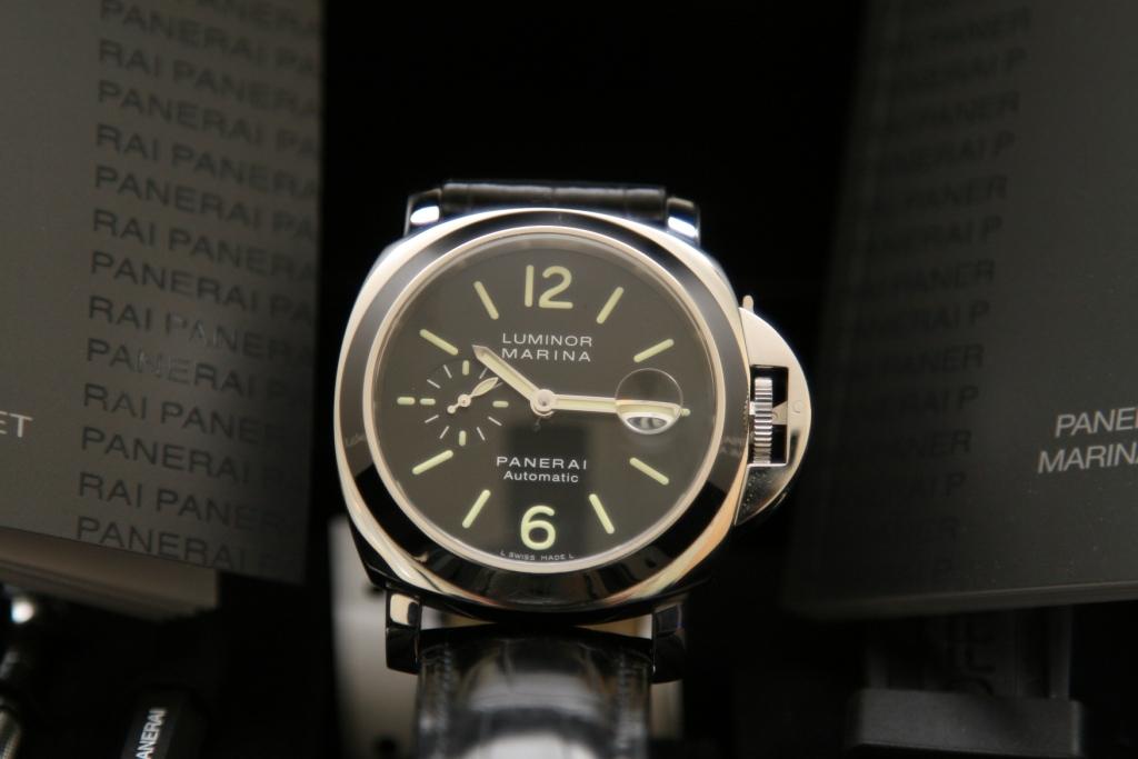 Учитывая, что явных фаворитов в линейке Pam у меня нет (мне просто искренне нравится очень много моделей Люминоров и Радиомир) приобрести пока решил достаточно классическую и для меня (субъективно) беспроигрышную по функциям/дизайну/внешнему виду модель - 104. Понравилась в данном случае полированная сталь, черный цвет, крокодил и бабочка, классические простые функции - дата, секунда, вообщем: инструмент на каждый день и на любой день, скажем так. Как ни странно, но даже "лупа" над датой при ближайшем рассмотрении в Конкесте тоже была отнесена мною к плюсам.