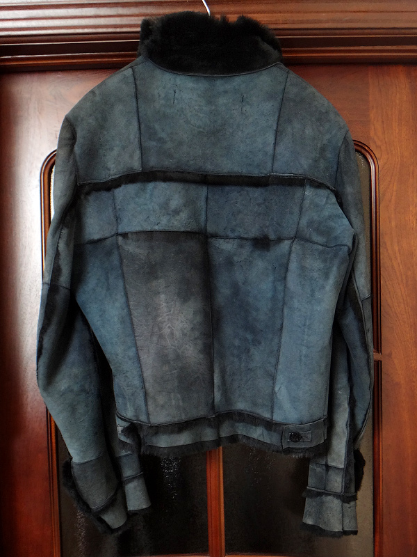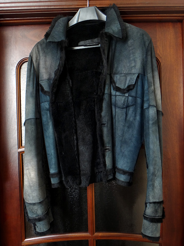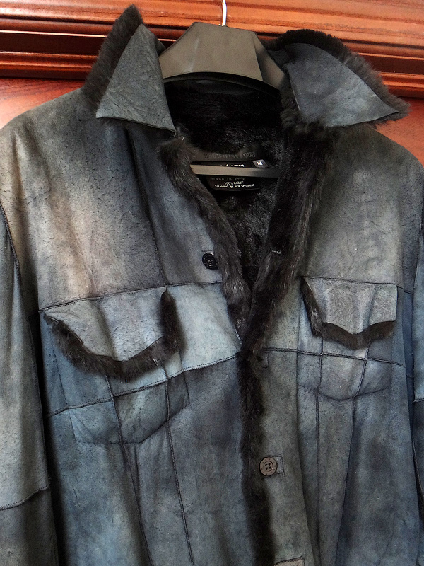 Дубленка на меху, из кролика, по фасону как куртка, цвет деним с сильной distressed-обработкой (эффект поношенности).