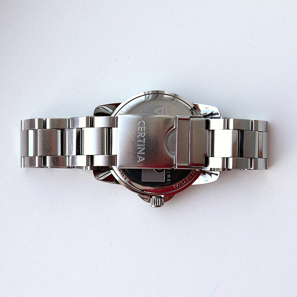 Вашему вниманию предлагаются часы Certina без особых наворотов (если не считать DS), увеличенного размера. Куплены в магазине в 2011-м, о чем имеется отметка в гарантийном талоне. Естественно, были в употреблении, но сохранили хорошее эстетическое состояние. Следы эксплуатации сводятся к небольшим потертостям и царапинам корпуса и браслета (см. фото). Стекло в идеальном состоянии - сапфир, однако. Функционально часы безупречны: идут точно, дата сменяется как положено.