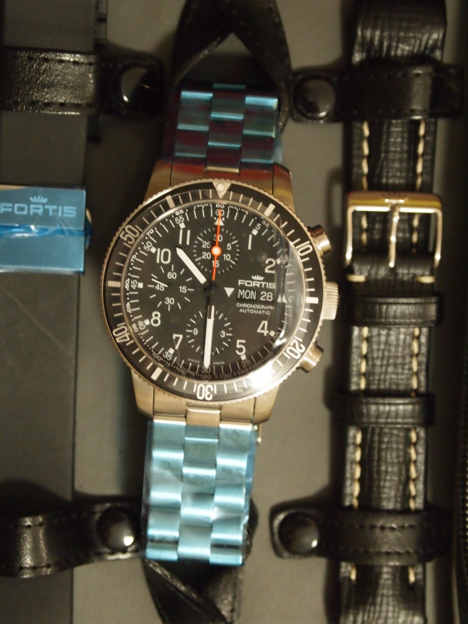 В комплекте часы, 3 ремешка, отвертка, коробочка с доп. шпильками, фирменный чехол .