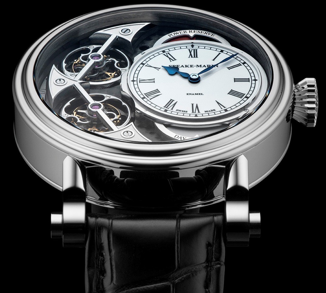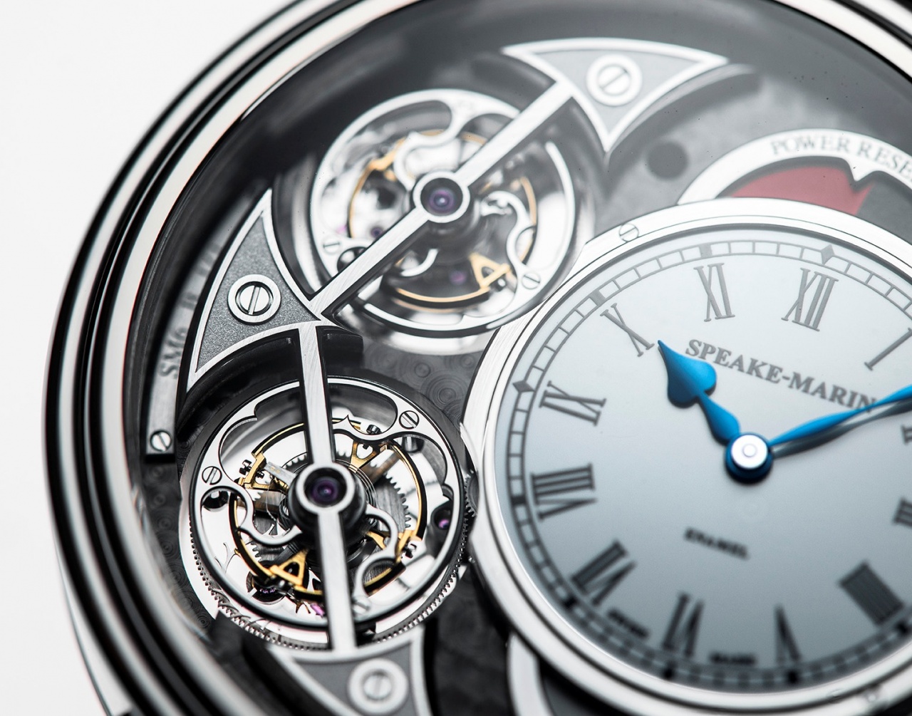 Как и в прошлогодней модели, часы и минуты показаны на смещенном на «3 часа» дополнительном циферблате, покрытом белой эмалью. Его дизайн заимствует черты первых карманных часов с турбийоном, которые Питер Спик-Марин выпустил под собственным брендом. Римская нумерация часа, минутная шкала в стиле железнодорожных часов и синие стрелки из вороненой стали являются атрибутами фирменного стиля Speake-Marin. Над циферблатом расположен индикатор 72-часового запаса хода, с обратной стороны его визуально уравновешивает указатель день/ночь.