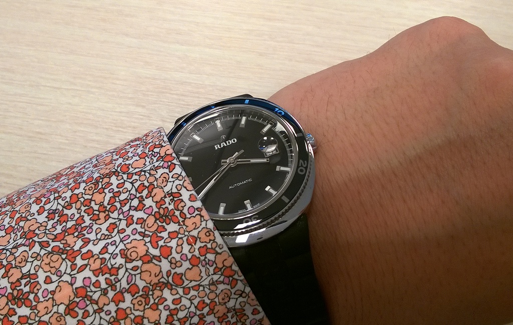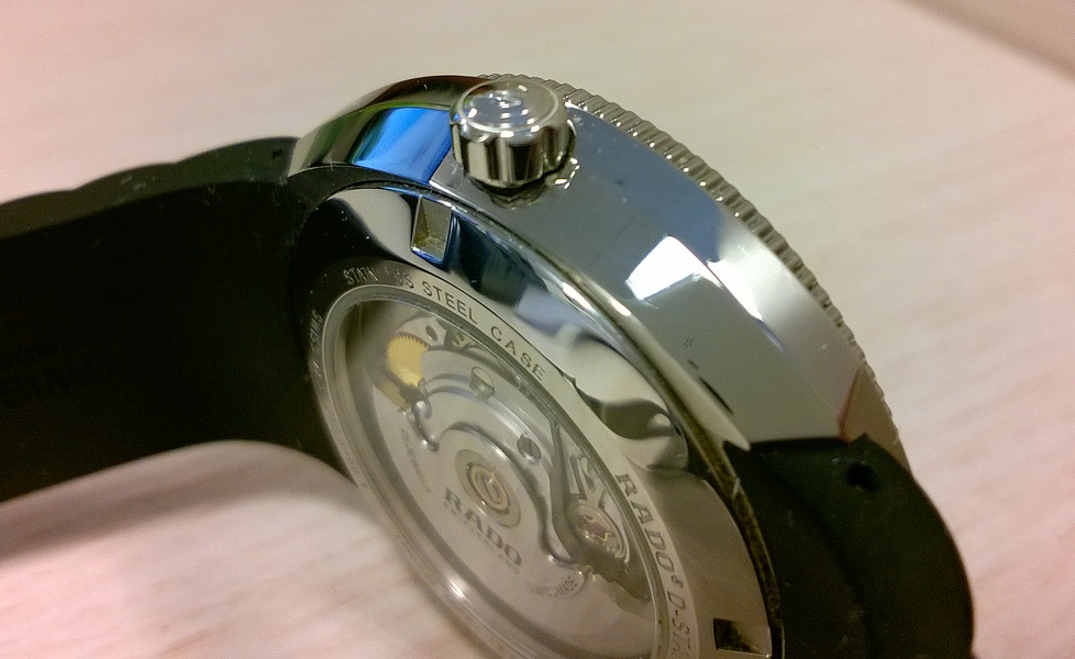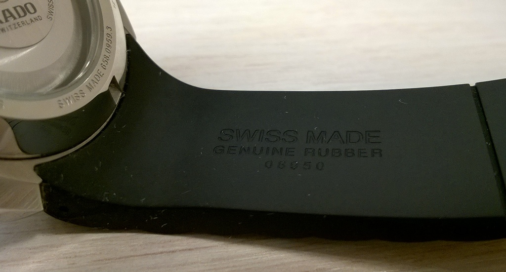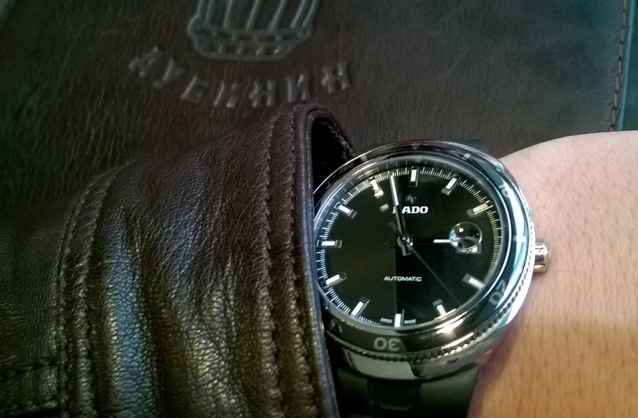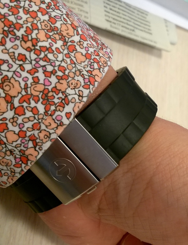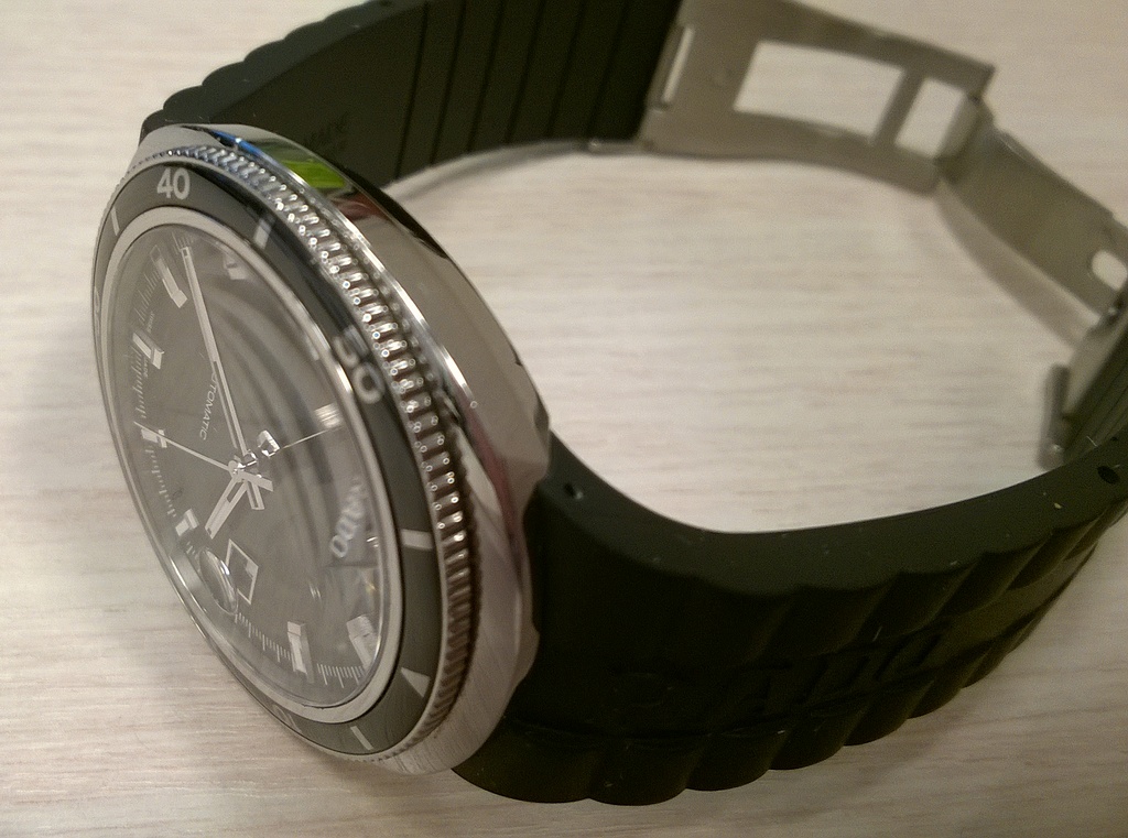 Итак, чёрный цифер, чёрный керамический безель, на чёрном же резиновом ремне. Качество каучука потрясающее - толстый, но мягкий, а застёжка, сделанная из нержавеющей стали, радует чёткостью фиксации.
