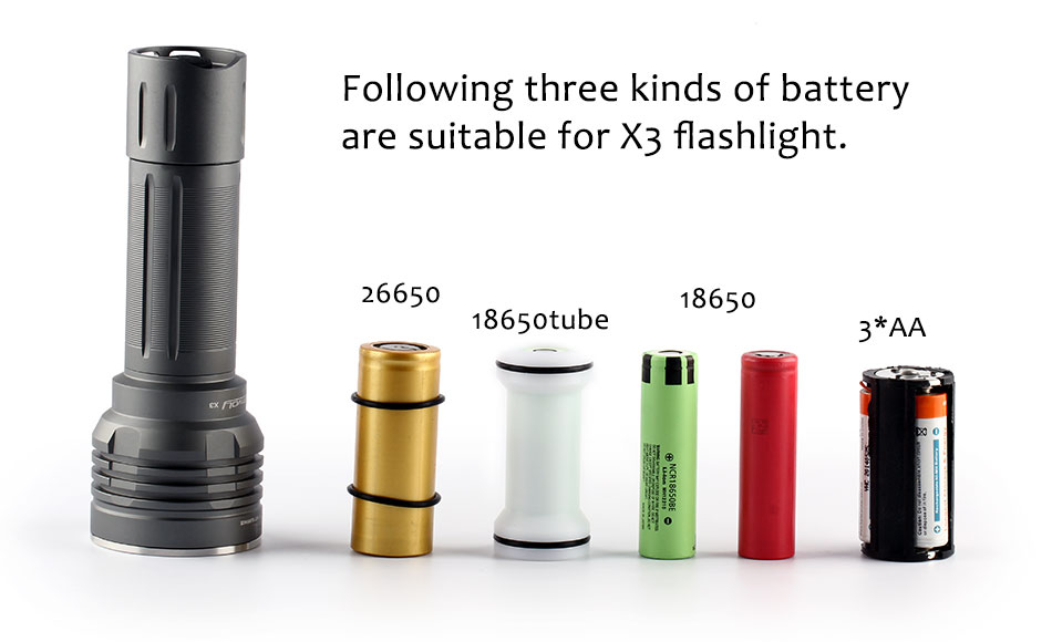 Тип батареи: 3 х АА через переходник, 1 х 18650 с гильзой (с защитой и без) , 1 х 26650 (с защитой и без) – в комплект не входит