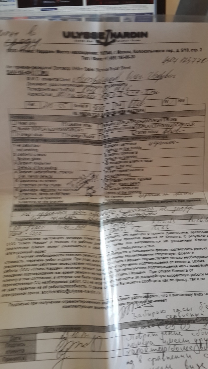 В сервис ULYSSE NARDIN обратился 23.10.2015г. после всех бесконечных переписок и экспертиз часы забрали 5.05.2016г.!!!