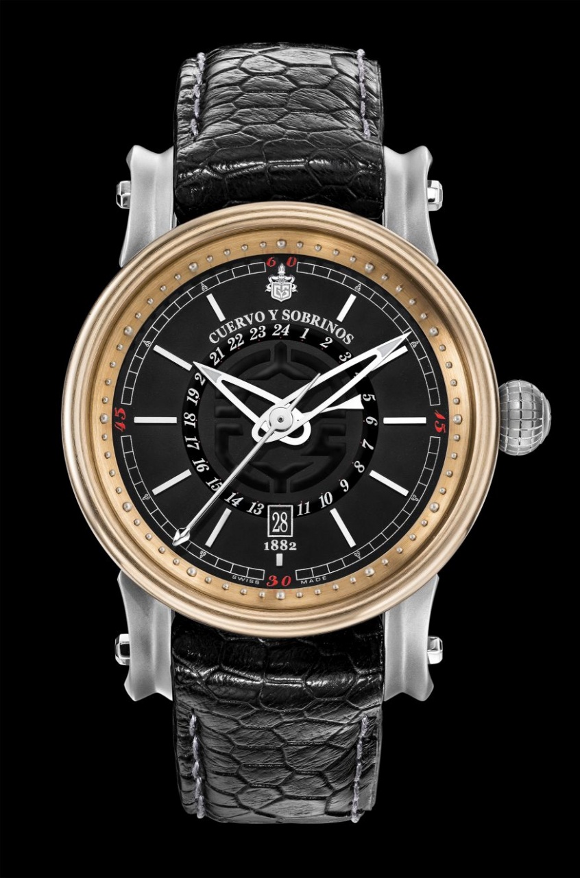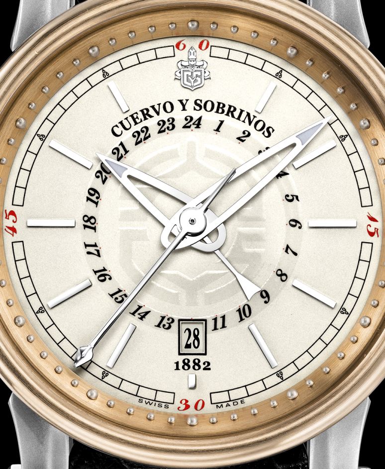 Круглый корпус новинки имеет модульную конструкцию, изготовлен из бронзы, титана и полированной стали. Его диаметр составляет 45,0 мм, толщиной 12,4 мм, водонепроницаемый до 50 метров. Крупная рифленая заводная головка, выполненная в луковицеобразной форме, расположена на 3 часах; на ее торце выгравировано изображение эмблемы бренда Cuervo y Sobrinos. Сапфировое стекло установлено на передней стороне часового корпуса (с антибликовым покрытием) и на его завинчивающейся задней крышке. Циферблат размечен накладными продолговатыми часовыми индексами, круглыми объемными накладными минутными индексами (расположенными на фланце) и круглой 24-часовой шкалы, размещенной вокруг центральной части циферблата. Стрелки серебристого цвета, в том числе скелетонизированные часовая и минутная с наконечниками, покрытыми люминесцентным составом серого цвета. Модель оснащена швейцарским автоматическим механизмом Cuervo y Sobrinos CYS5123 (базовый калибр Sellita SW330.1), на 25 камнях, с балансовой частотой 28800 полуколебаний в час (4 гц), 40-часовым запасом хода, с функциями индикации часов, минут, секунд (посредством соответствующих центральных стрелок), даты (посредством соответствующего цифрового указателя в прямоугольной апертуре, расположенной на 6 часах), а также времени второго часового пояса (посредством специальной короткой центральной стрелки).