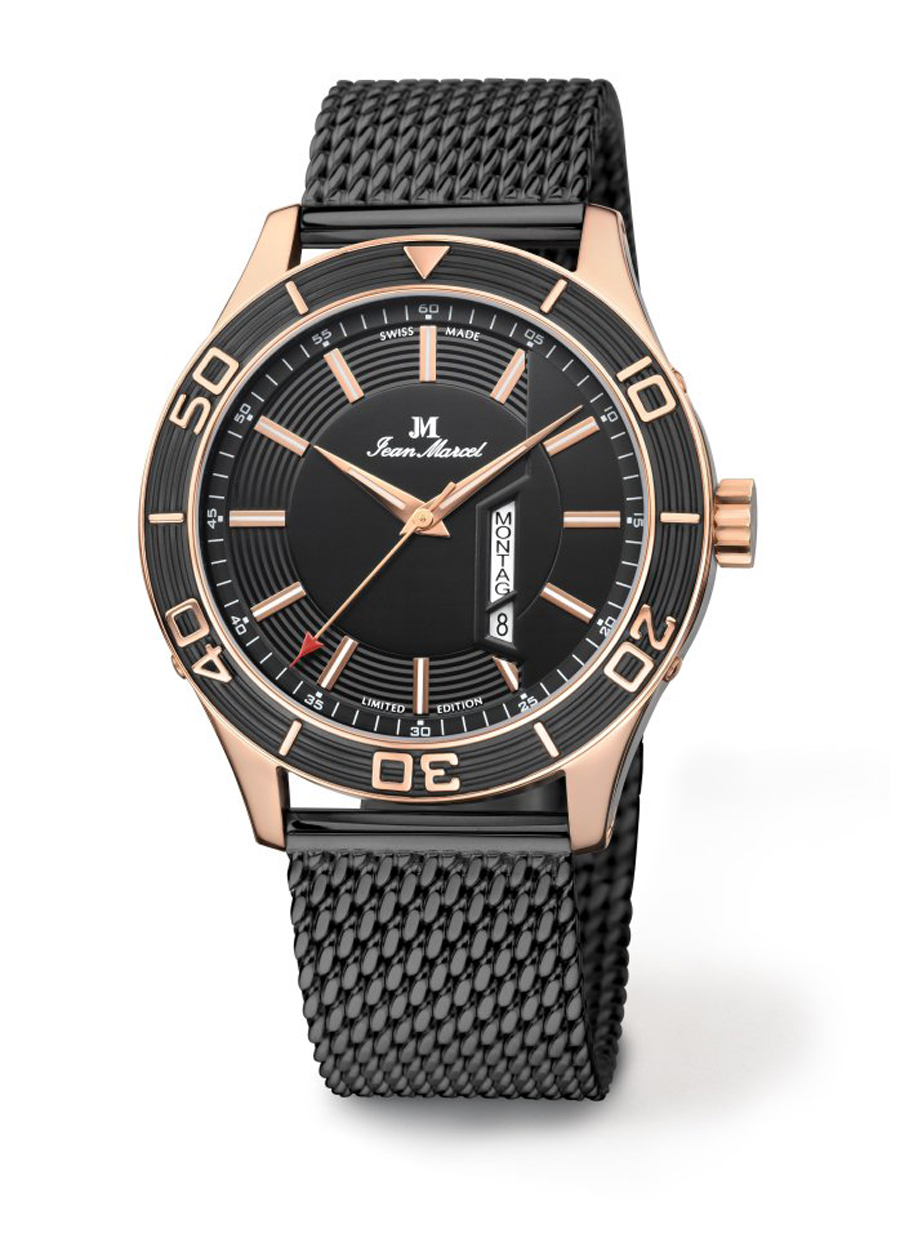 Круглый корпус новинки, изготовленный из нержавеющей стали или из нержавеющей стали с PVD-покрытием, диаметром 44,0 мм, водонепроницаемый до 100 метров. На торце рифленой заводной головки, расположенной на 3 часах, выгравировано изображение логотипа бренда Jean Marcel. Фиксированный безель с рельефной разметкой, с черным PVD-покрытием. Сапфировое стекло установлено на передней стороне часового корпуса (с антибликовым покрытием) и на его завинчивающейся задней крышке. Двухуровневый циферблат серого или черного цвета с накладными арабскими цифрами и часовыми индексами, покрытыми, как и часовая и минутная стрелки, люминесцентным составом белого цвета. Треугольный наконечник секундной стрелки окрашен в контрастный красный цвет. Модель оснащена модифицированным швейцарским автоматическим механизмом ETA 2836, с функциями индикации часов, минут, секунд (посредством соответствующих центральных стрелок), а также дня недели и даты (посредством соответствующих буквенного и цифрового указателей в спаренных четырехугольных апертурах, расположенных вертикально на 5 часах или горизонтально на 2 часах).