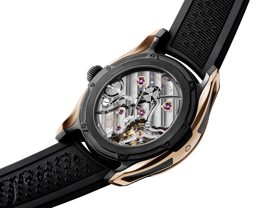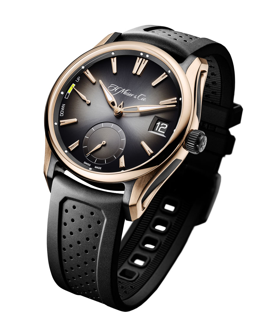 Круглый многокомпонентный корпус новинки, изготовленный из 18-каратного розового золота и титана с черным DLC-покрытием , диаметром 42,8 мм, водонепроницаемый до 120 метров. На торце завинчивающейся рифленой заводной головки, расположенной на 3 часах, выгравировано изображение буквы "M" - логотип бренда H. Moser & Cie. Сапфировое стекло установлено на передней стороне часового корпуса и на его завинчивающуюся заднюю крышку. Черный циферблат с накладными продолговатыми золотыми часовыми индексами, с маленькими круглыми часовыми маркерами, покрытыми, как и часовая и минутная стрелки, люминесцентным составом белого цвета. Все стрелки выполнены из розового золота. Модель оснащена мануфактурным механизмом с ручным заводом H. Moser & Cie HMC800, с двумя заводными барабанами, семидневным запасом хода, функциями индикации часов, минут (посредством соответствующих центральных стрелок), секунд (на соответствующем малом боковом циферблате, расположенном на 6 часах), даты (посредством соответствующего цифрового указателя в крупной прямоугольной апертуре, расположенной на 3 часах), месяца (посредством соответствующей короткой остроконечной центральной стрелки, согласно часовым маркерам циферблата, где каждый час соответствует порядковому номеру месяца), запаса хода (посредством соответствующего аналогового указателя, расположенного на 9 часах) и високосного года (соответствующий звездообразный указатель расположен на задней стороне механизма и просматривается сквозь сапфировое стекло на задней крышке корпуса). Калибр отлично отделан и декорирован.