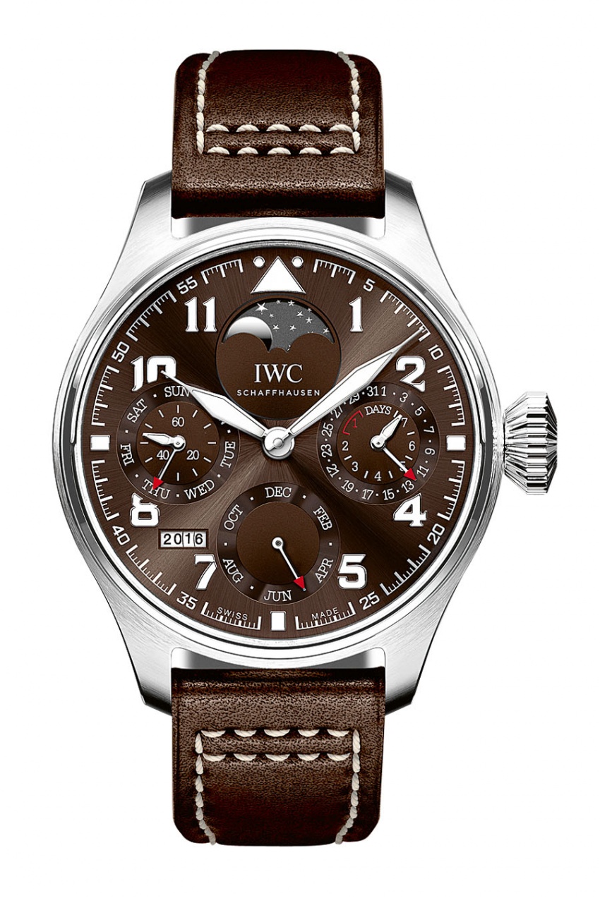 Новая лимитированная модель Big Pilot’s Watch Perpetual Calendar Edition "Antoine de Saint-Exupéry" от швейцарской часовой компании IWC имеет круглый корпус, изготовленный из нержавеющей стали, диаметром 46,0 мм, водонепроницаемый до 60 метров. Крупная рифленая заводная головка расположена на 3 часах. Выпуклое сапфировое стекло с двусторонним антибликовым покрытием защищает циферблат табачно-коричневого цвета с накладными арабскими цифрами и часовыми индексами, покрытыми, как и часовая и минутная стрелки, люминесцентным составом белого цвета. Модель оснащена мануфактурным автоматическим механизмом IWC 52610, с вечным календарем (не нуждающемся в корректировке до 2100 года), с двумя заводными барабанами, золотым ротором автоподзавода, семидневным (168-часовым) запасом хода, функциями индикации часов, минут (посредством соответствующих центральных стрелок), секунд и дня недели (на совмещенном круглом аналоговом указателе, расположенном на 9 часах), даты и запаса хода (на совмещенном круглом аналоговом указателе, расположенном на 3 часах), месяца (на соответствующем круглом аналоговом указателе, расположенном на 6 часах), года (посредством соответствующего цифрового указателя в прямоугольной апертуре, расположенной между 7 и 8 часами), фаз Луны (посредством соответствующего круглого указателя).