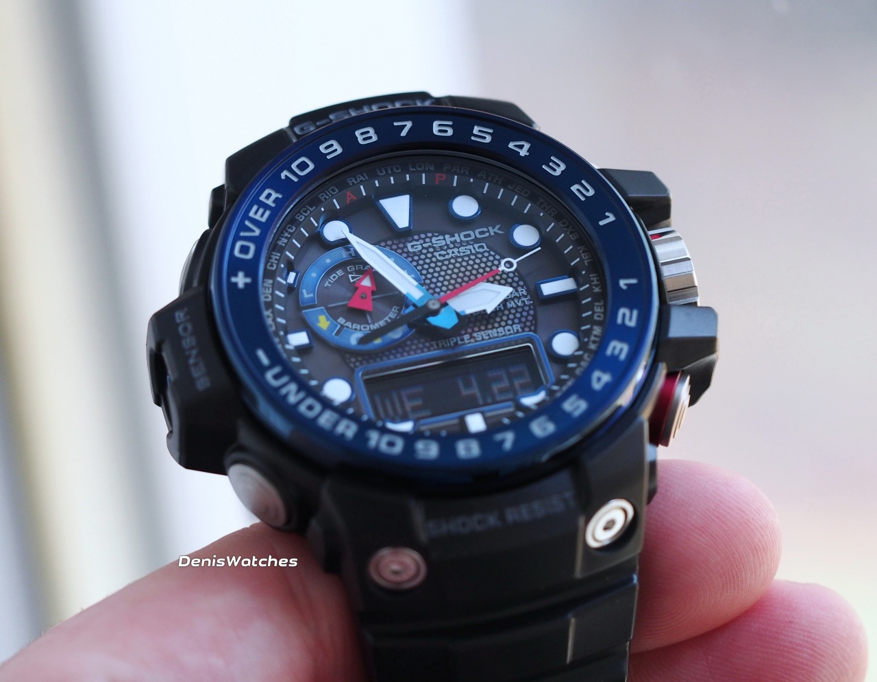 Это первая модель из серии G-Shock, у которой есть комбинированный дисплей и тройной сенсор, т.е. присутствуют барометр, термометр и компас.