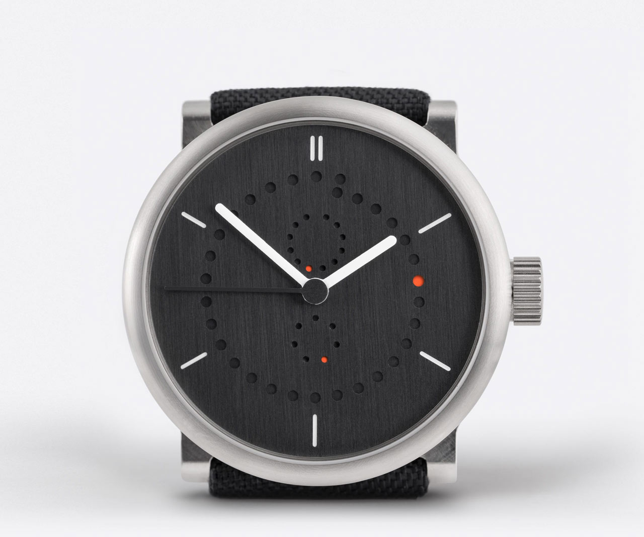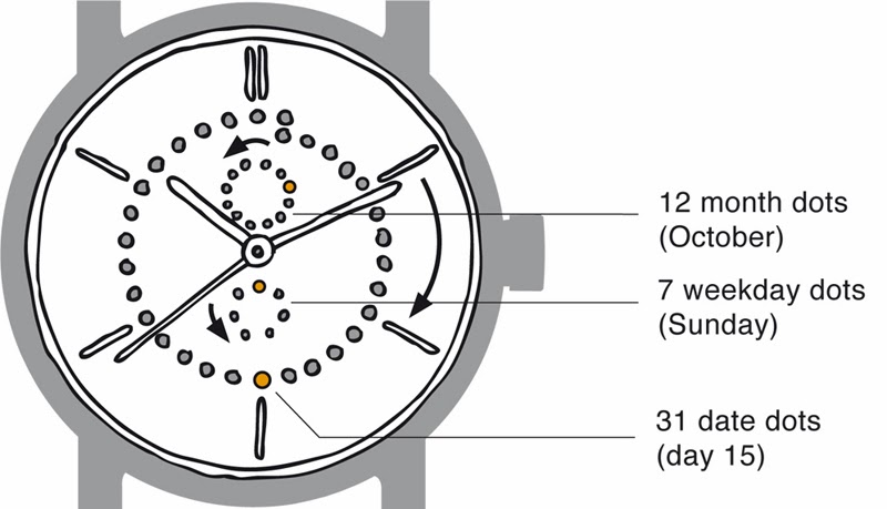 Новинка имеет круглый корпус, диаметром 42,0 или 39,0 мм, водонепроницаемый до 50 метров. Рифленая заводная головка расположена на 3 часах. Матово-черный циферблат защищает сапфировое стекло с антибликовым покрытием. Часовая и минутная стрелки белого цвета, а секундная - черного. Модель оснащена швейцарским автоматическим механизмом ETA 2824-2, модифицированным Людвигом Охслином, с балансовой частотой 28800 полуколебаний в час (4 гц), 38-часовым запасом хода, функциями индикации часов, минут, секунд (посредством соответствующих центральных стрелок), даты (посредством оранжевой точки, "передвигающейся" по часовой стрелке на перфорированном центральном "циферблате", состоящем из 31 микроапертуры), дня недели (посредством оранжевой точки, "передвигающейся" против часовой стрелки на перфорированном малом боковом "циферблате", расположенном на 6 часах, и состоящем из семи микроапертур), месяца (посредством оранжевой точки, "передвигающейся" против часовой стрелки на перфорированном малом боковом "циферблате", расположенном на 12 часах, и состоящем из двенадцати микроапертур).