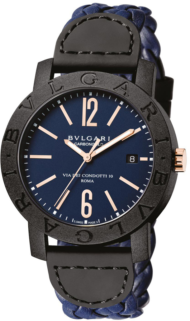 Новые Bvlgari Bvlgari Carbon Gold созданы в различных цветовых комбинациях: черной, коричневой и синей. Во всех трех версиях золотые стрелки и часовые метки напоминают о ювелирном наследии мануфактуры. Стрелки и точки возле часовых маркеров отмечены Superluminova, что обеспечивает идеальную читаемость часов, минут и секунд при любом освещении.