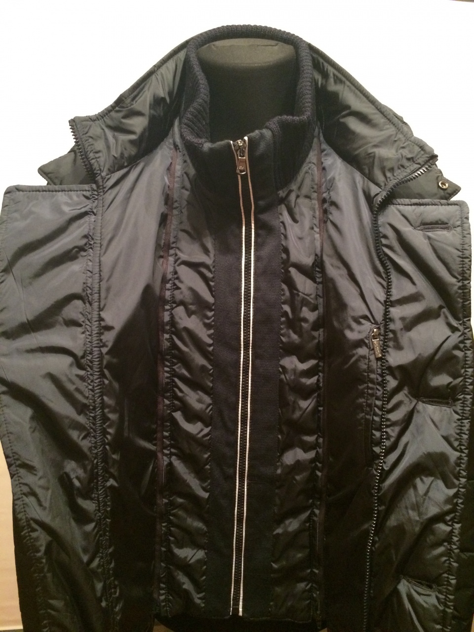 Отличная куртка сделана в виде бушлата! Имеется отстегивающийся капюшон и отстегивающаяся внутренняя жилетка (фото).