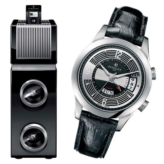 Один из самых необычных концептов был недавно представлен маркой Perrelet. Идея заключалась в создании необычной шкатулки для часов, представляющей собой музыкальную «башню» The Tower из лакированного темного дерева и алюминия с гнездом для iPod nano на 8GB, колонками Logitech и встроенными модулями для хранения часов Swisskubik. Модули предназначены для хранения часов из «музыкальной» коллекции Perrelet Limited Edition Perrelet Maestro Collection - Perrelet 5-Minute Repeater с 5-минутным репетиром и Perrelet Alarm с функцией будильника.