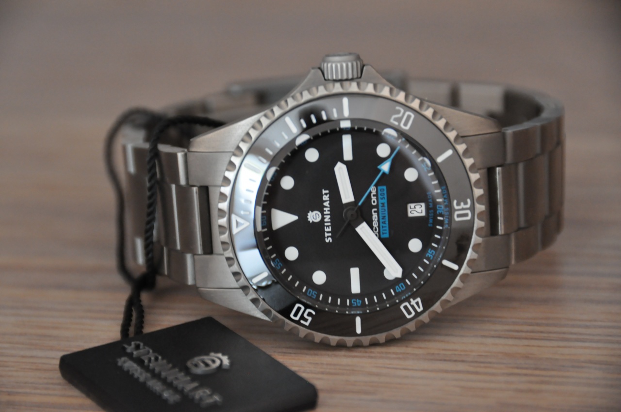 STEINHART OCEAN Titanium 500 Premium. Куплены неделю назад в Германии на официальном сайте, но не зацепили. Дайверы, вероятно, не мое. Сатинированный титановый корпус и браслет, сапфировое стекло, механизм Soprod A10-2, стоп-секунда, крутящийся безель, дата на 18 часах, завинчивающаяся заводная головка, диаметр 42 мм.. Удобные, легкие, прекрасная считываемость (в том числе и в темноте).