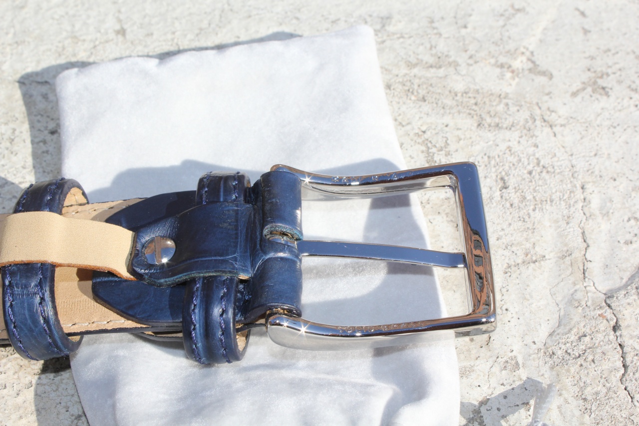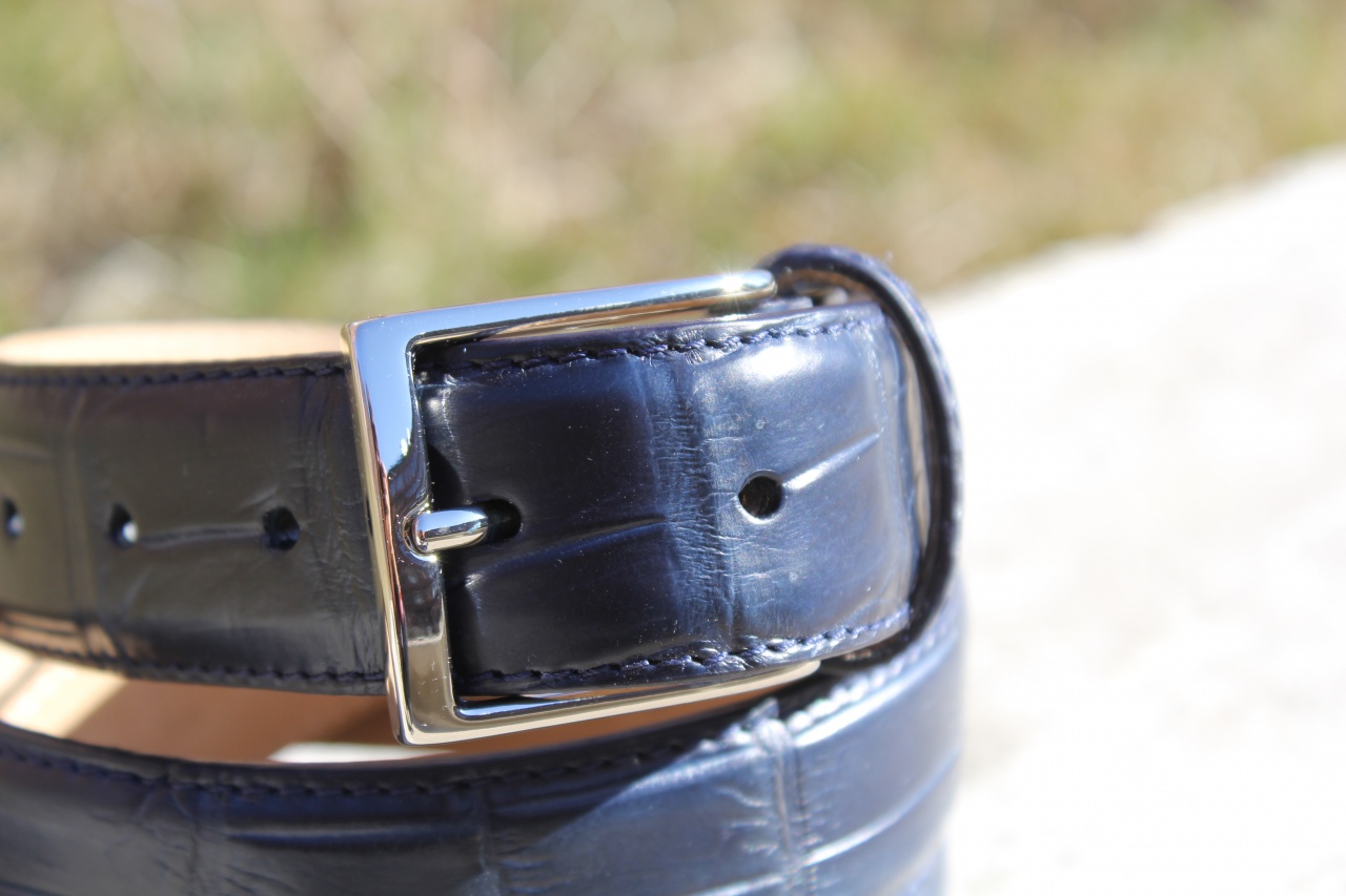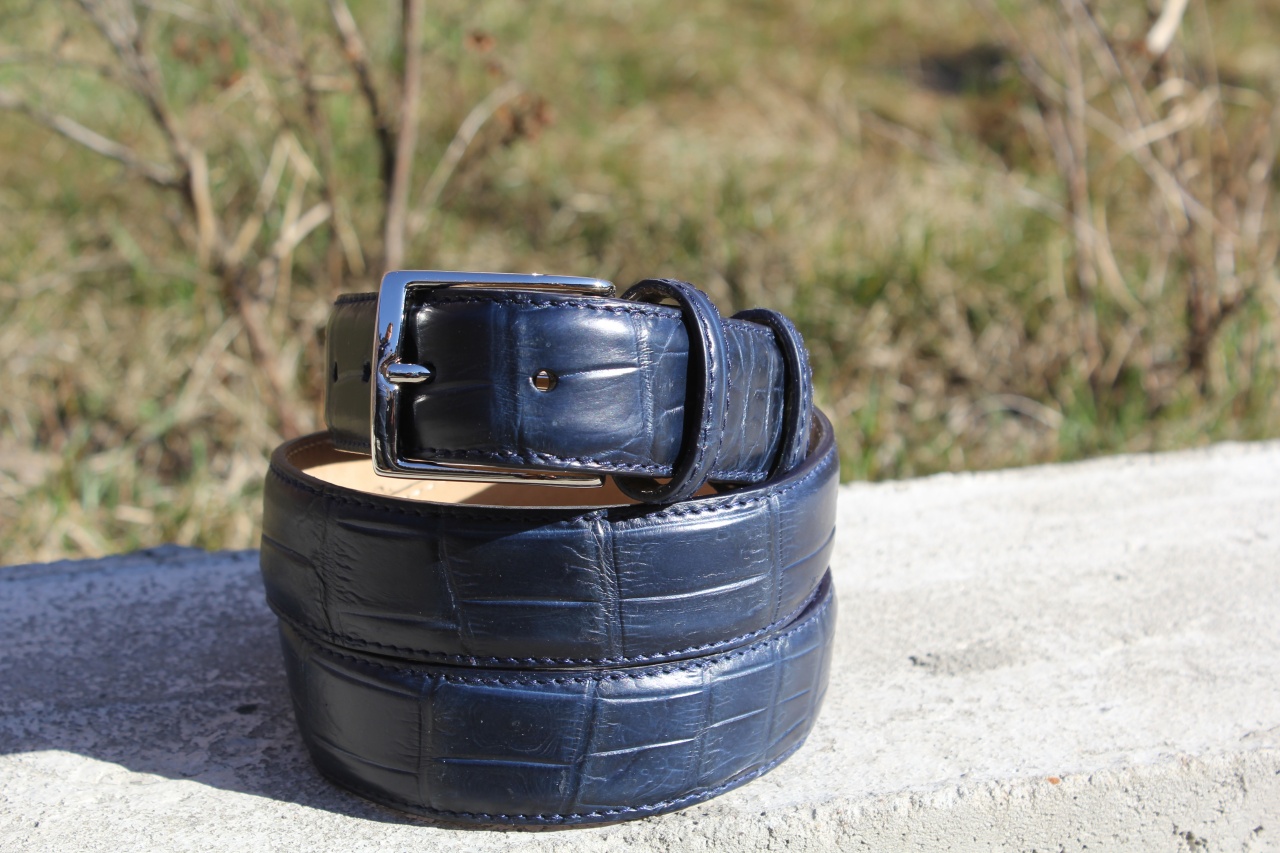 Синий классический мужской ремень ручной работы Brianza, изготовлен из 100% кожи крокодила высочайшего качества выделки.