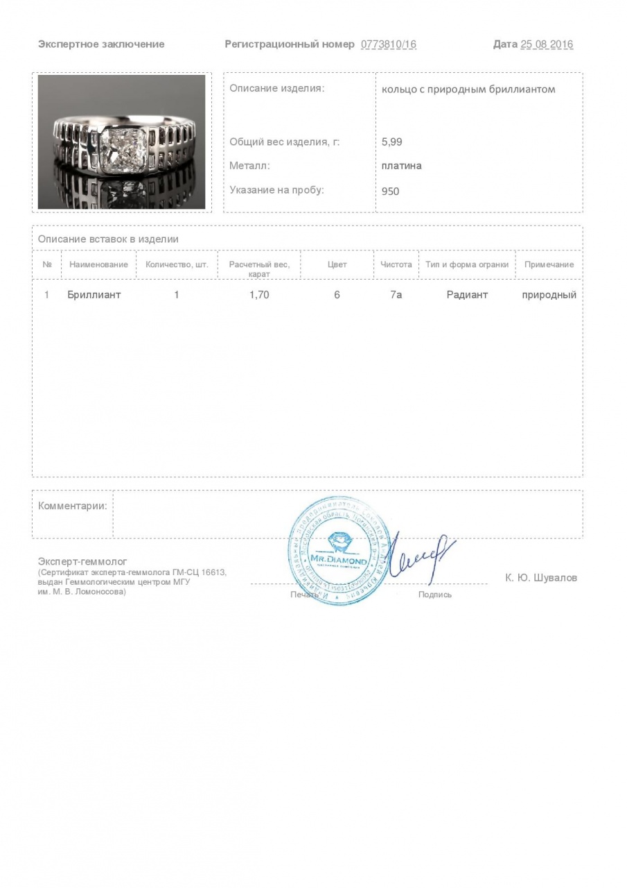 ПЛАТИНОВОЕ КОЛЬЦО С КРУПНЫМ БРИЛЛИАНТОМ 1.7Ct.