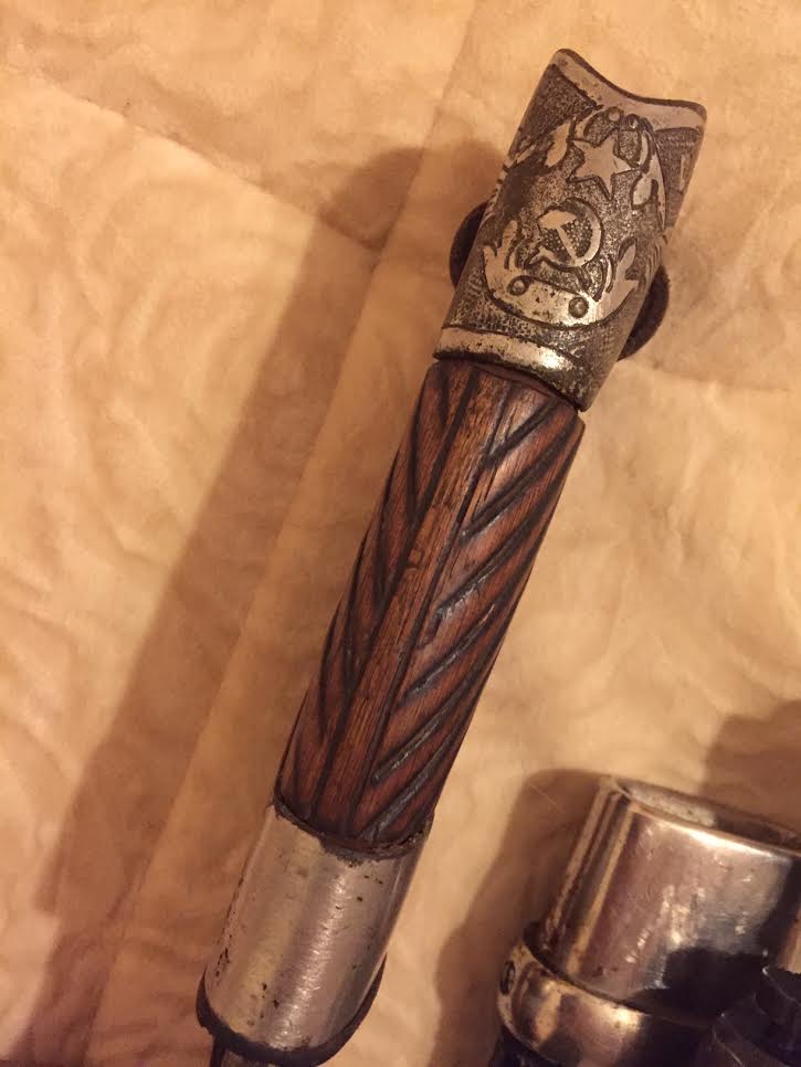 Рукоять деревянная, с никелированными навершием и втулкой. Навершие украшено изображением пятиконечной звезды и надписью "С.С.С.Р.".