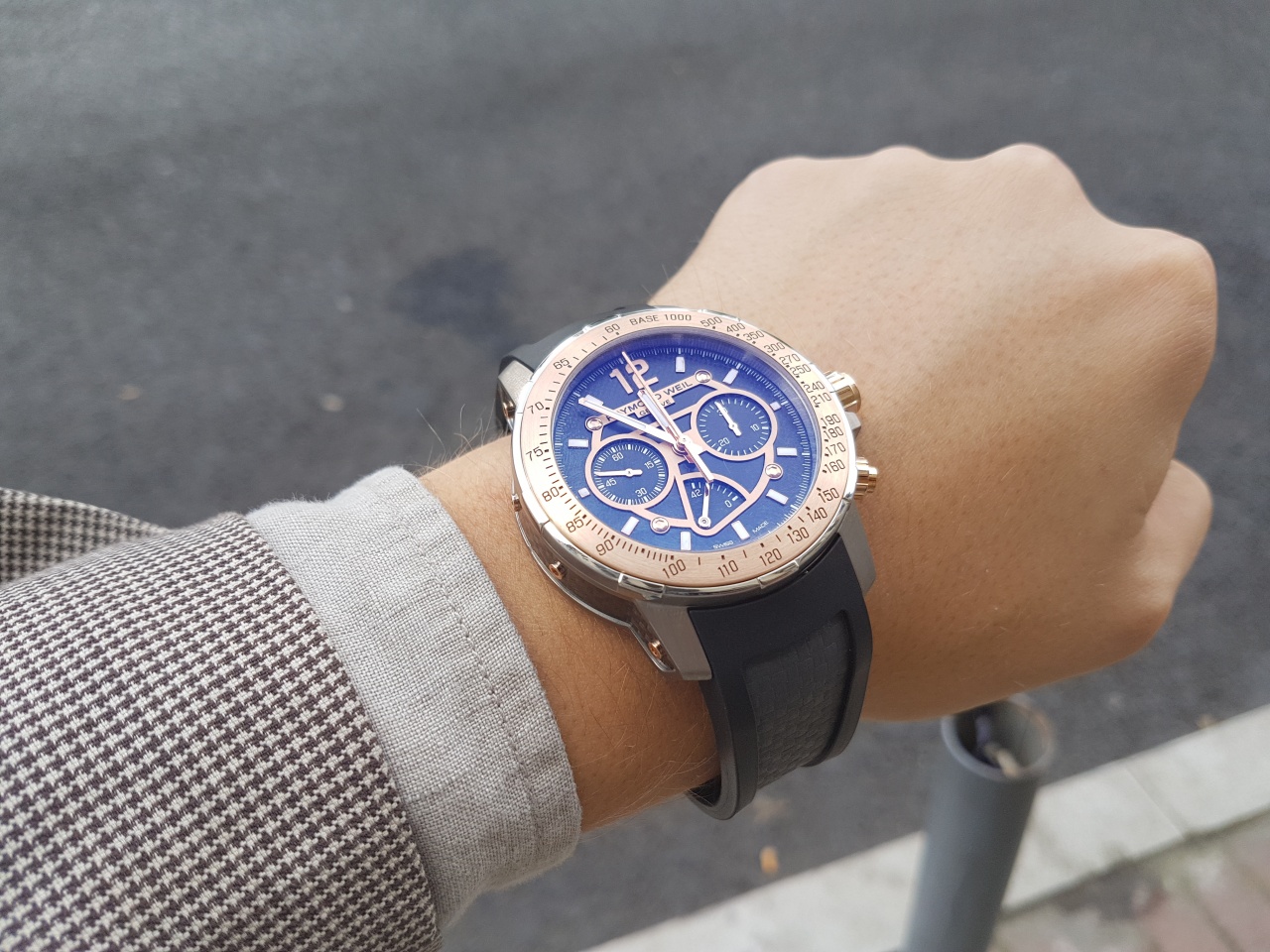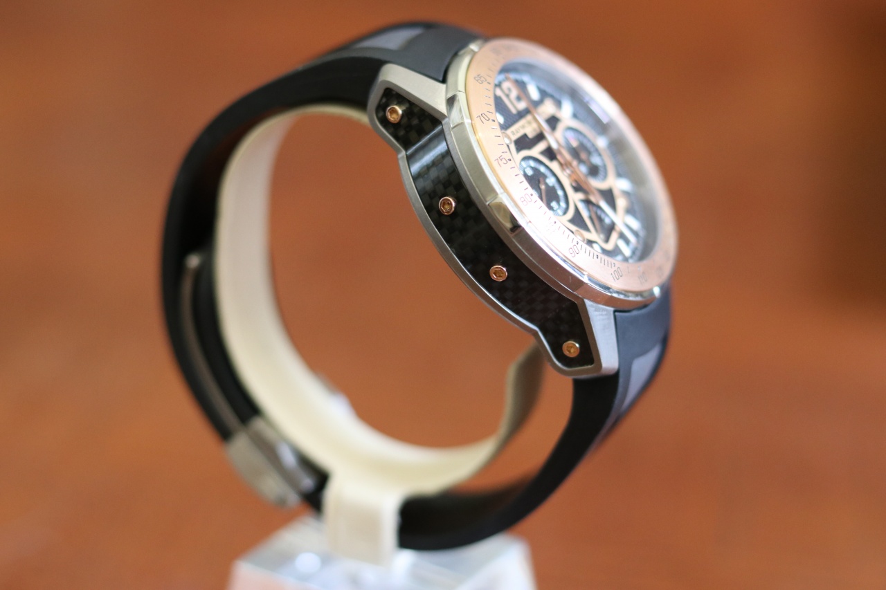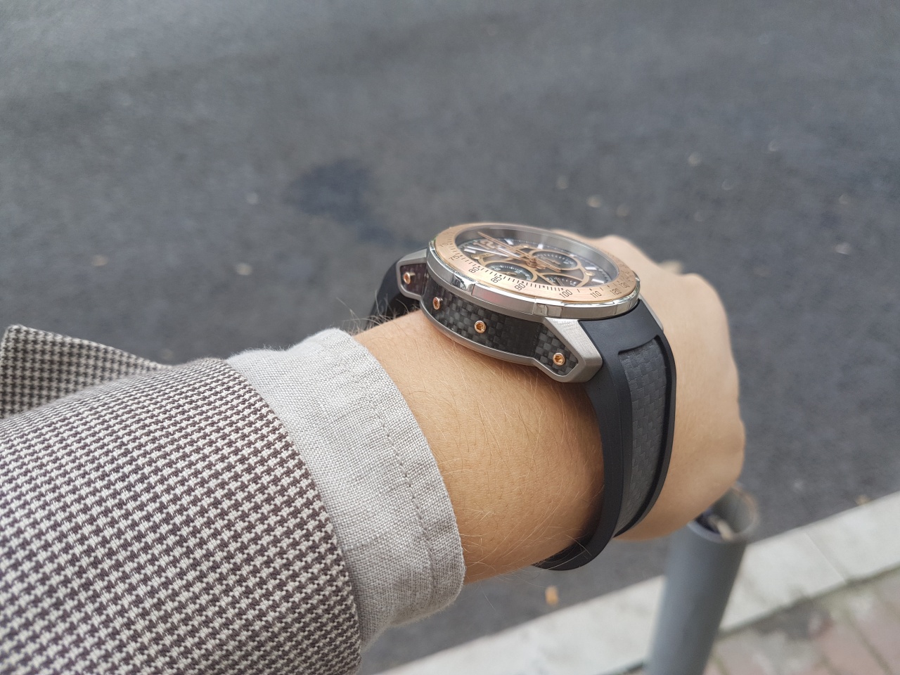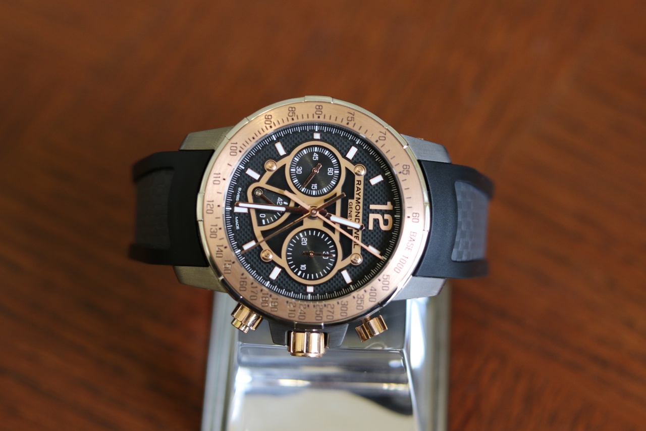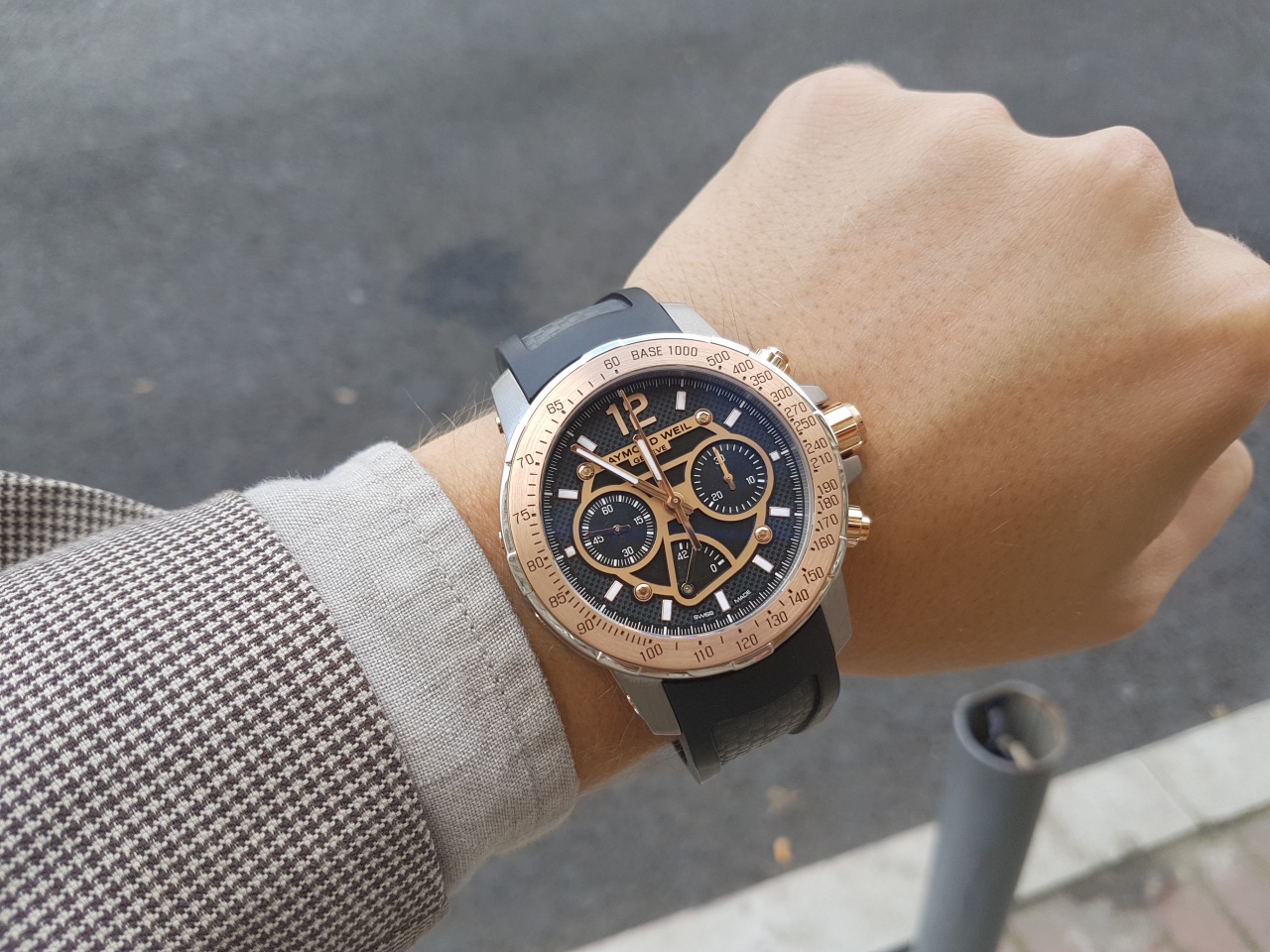 Крупный и очень сложный Raymond Weil! С космическим ретейлом в 15000$ Очень красивый корпус с сочетанием розового золота/титана/карбона! После полного сервиса все функции исправны! Очень удобно устроен сплит хронограф! Так же приятным дополнением является запас хода! Ремень на твердую 4+