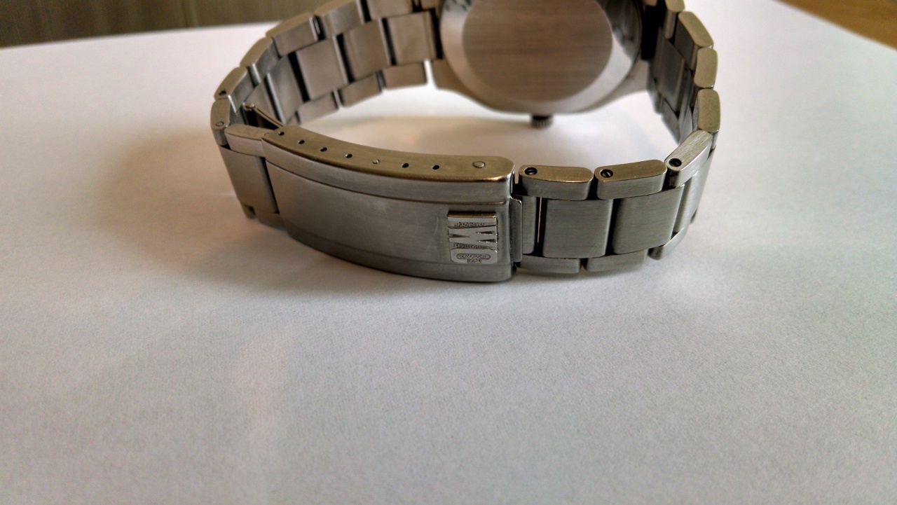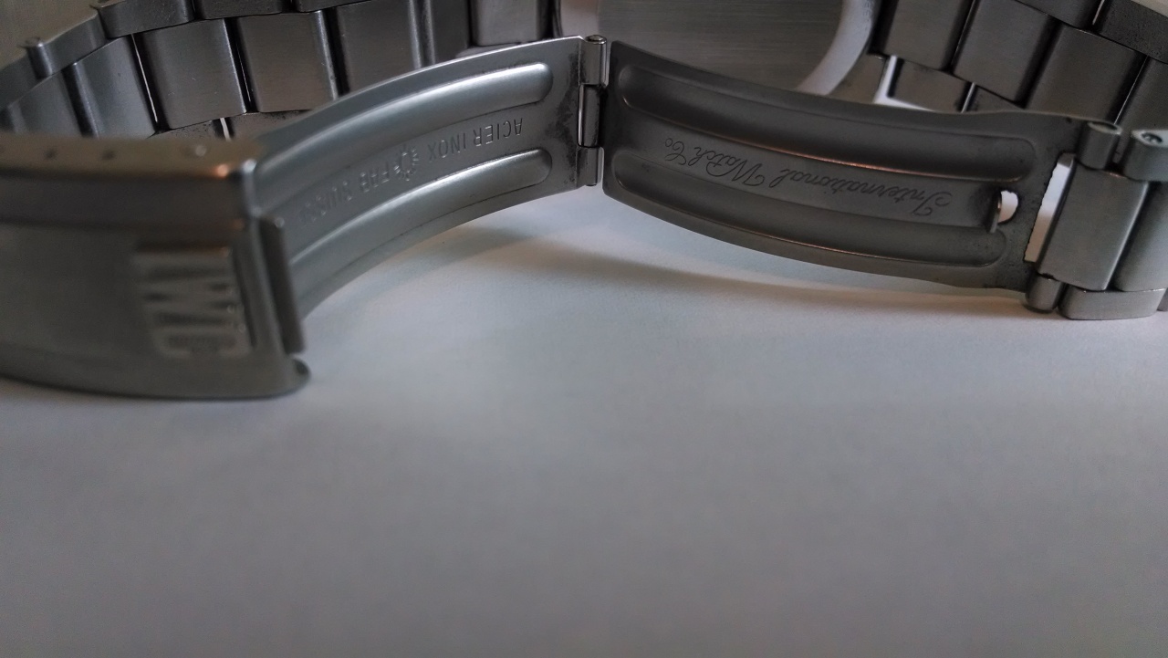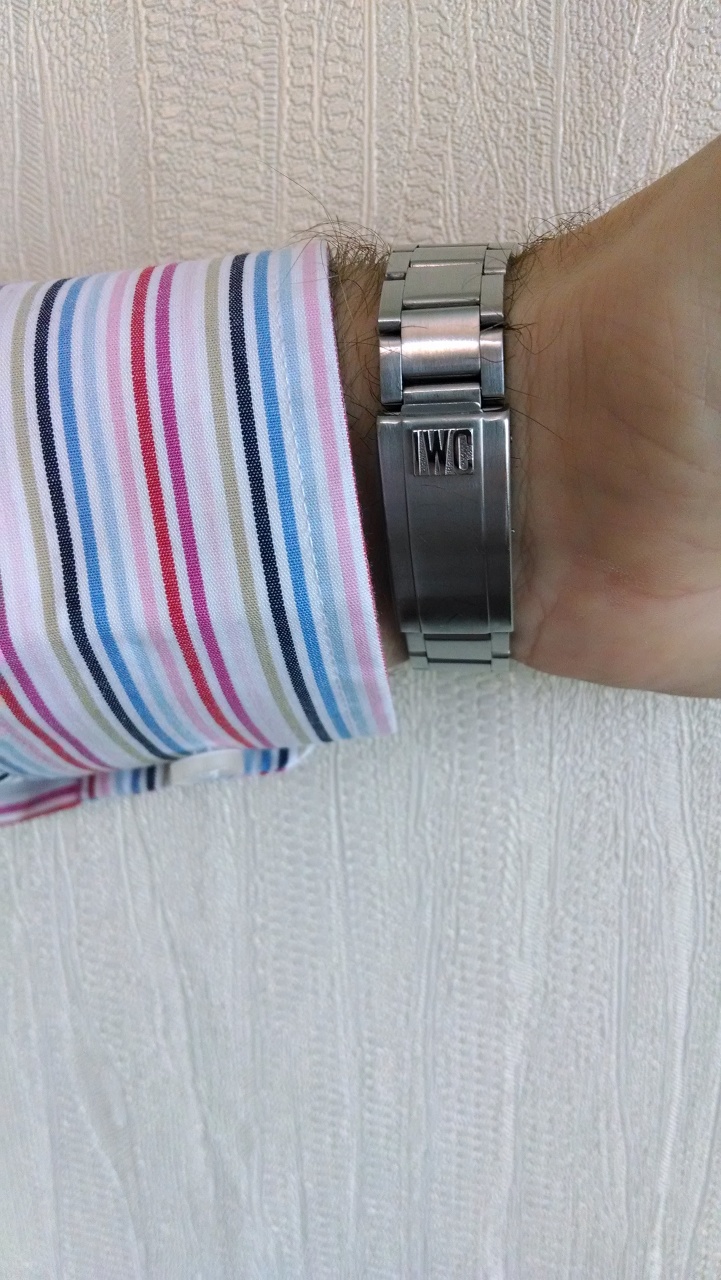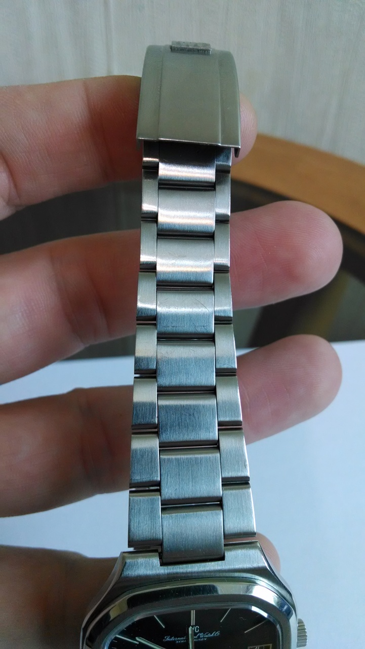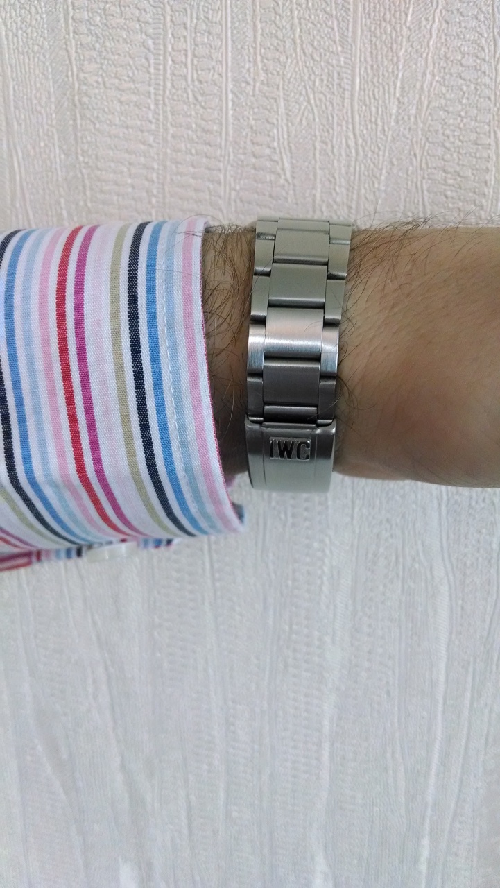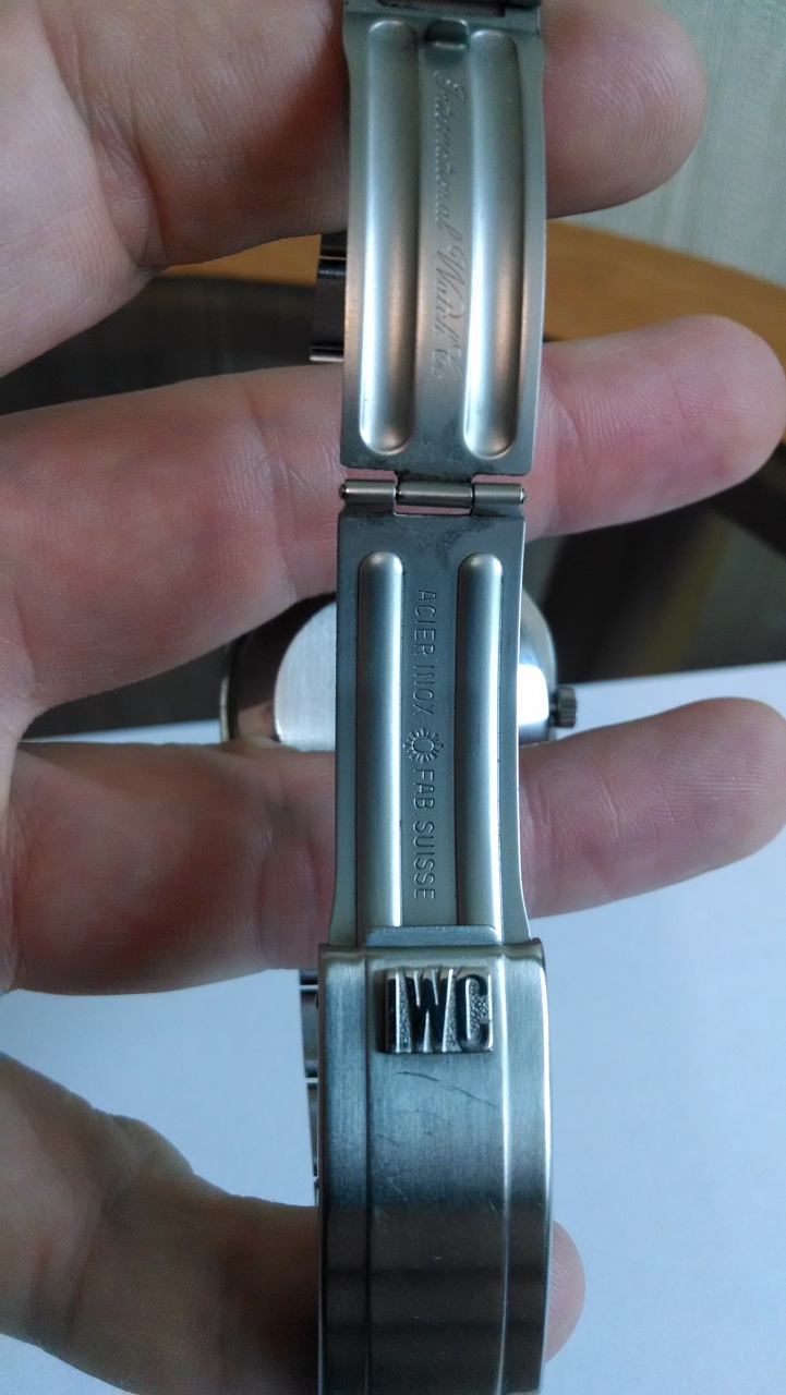 Интегрированный браслет на руку до 21 см., цельнолитые звенья на винтовых соединениях (ширина браслета 20 мм сужение на 17 мм), застежка с рельефной сигнатурой IWC. Есть несколько мелких царапинок на запястной части браслета и застежке (легко снимается полировкой)