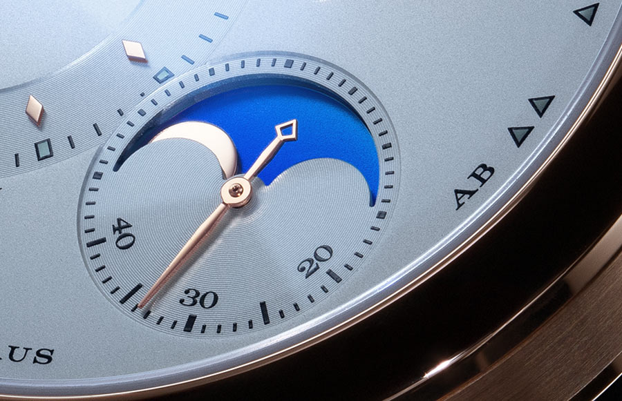 Круглый полированный корпус, диаметром 38,5 мм, толщиной 10,2 мм, водонепроницаемый до 30 метров. На торце рифленой заводной головки, расположенной на 3 часах, выгравировано наименование бренда A. Lange & Söhne. Сапфировое стекло установлено на передней стороне корпуса и на его завинчивающейся задней крышке. Циферблат накладными золотыми римскими цифрами, индексами и стрелками. Модель оснащена новым мануфактурным немецким механизмом с ручным заводом A. Lange & Söhne L121.3, собранным вручную, отрегулированным в пяти положениях, с балансовой частотой 21600 полуколебаний в час (3 гц), 72-часовым запасом хода, функциями индикации часов, минут (посредством соответствующих стрелок на децентрализованном циферблате, расположенном на 9 часах), секунд (на соответствующем малом боковом циферблате, расположенном на 5 часах), даты (посредством соответствующих цифровых указателей в двух апертурах, расположенных на 13 часах), запаса хода (посредством соответствующего аналогового указателя с секторной шкалой, расположенного на 3 часах), а также фаз Луны (посредством соответствующего указателя, совмещенного с малым боковым циферблатом, расположенным на 5 часах). Калибр отменно отделан и декорирован.