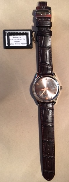 Классическая мужская модель, индикация даты в положении 3 часа, индикация запаса хода в положении 7 часов.