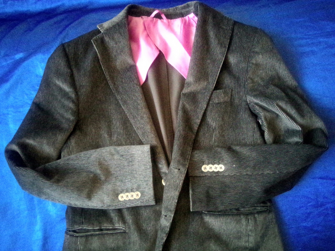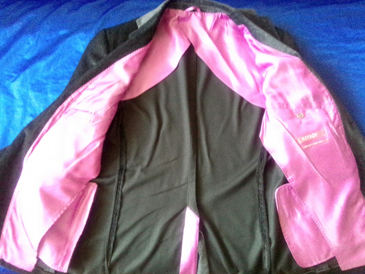 Широкие лацканы, два вшитых кармана, один нагрудный, два внутренних, одна шлица, розовый подклад, металлические пуговицы.