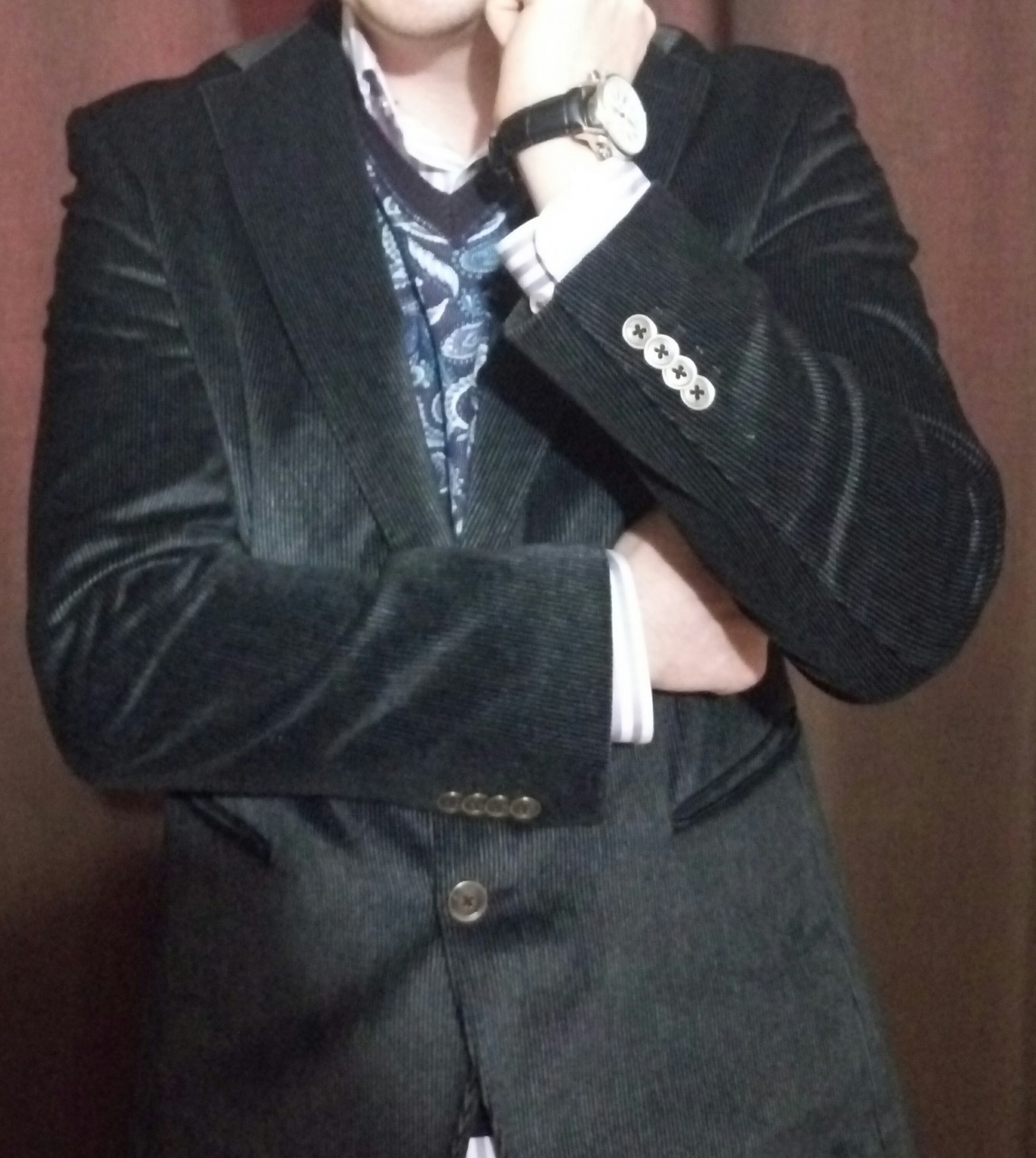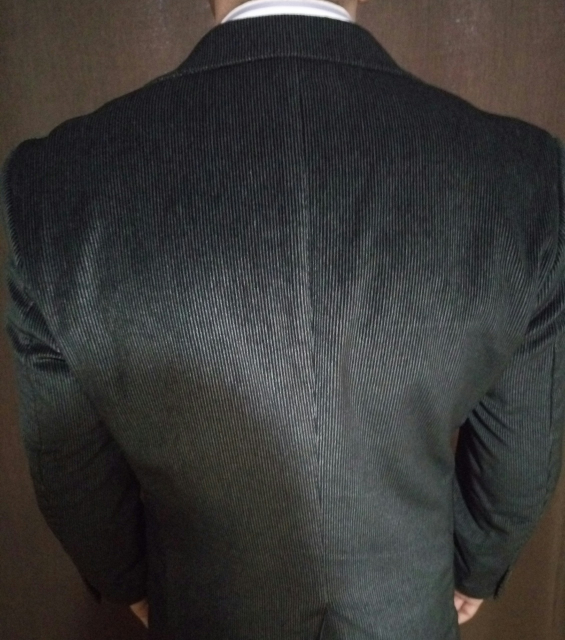Современный приталенный силуэт, пошит из дорогого плотного вельвета насыщенного черно-коричневого цвета.