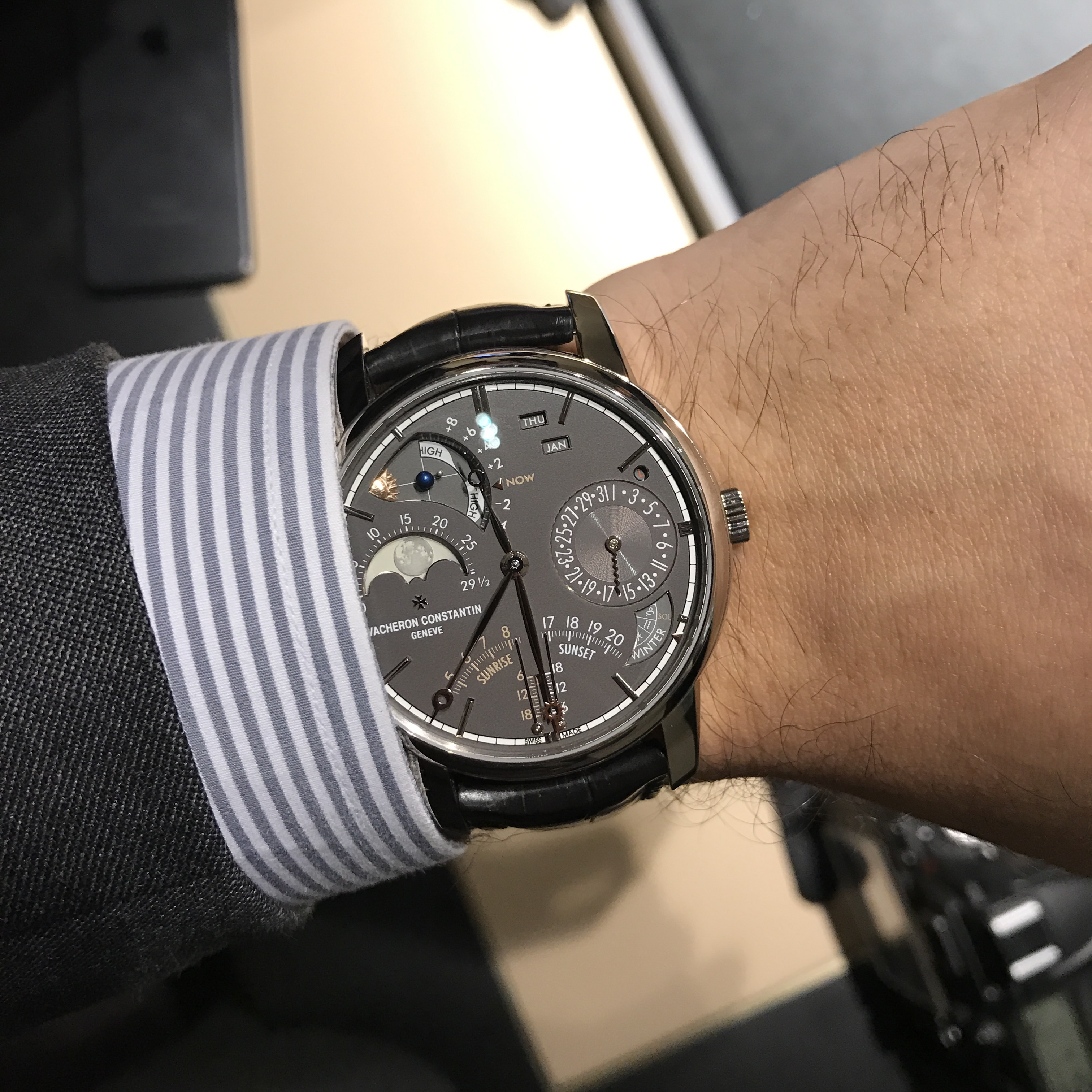 Уникальность часов заключается в том, что 23 усложнения отображаются на циферблатах, расположенных по обеим сторонам корпуса. С лицевой стороны находится угольно-серый циферблат с 15 искусно размещенными сложными функциями. Наряду с тремя коаксиальными стрелками, которые показывают гражданское и солнечное время (с функцией «бегущего» уравнения времени), на циферблате размещается вечный календарь с точным индикатором фаз Луны, а также впечатляющая функция mareoscope с индикатором чередования приливов и отливов и объемным изображением Земли, Луны и Солнца. Приливы и отливы подчиняются физическим законам и зависят от гравитации и центробежных сил этих трех небесных тел.