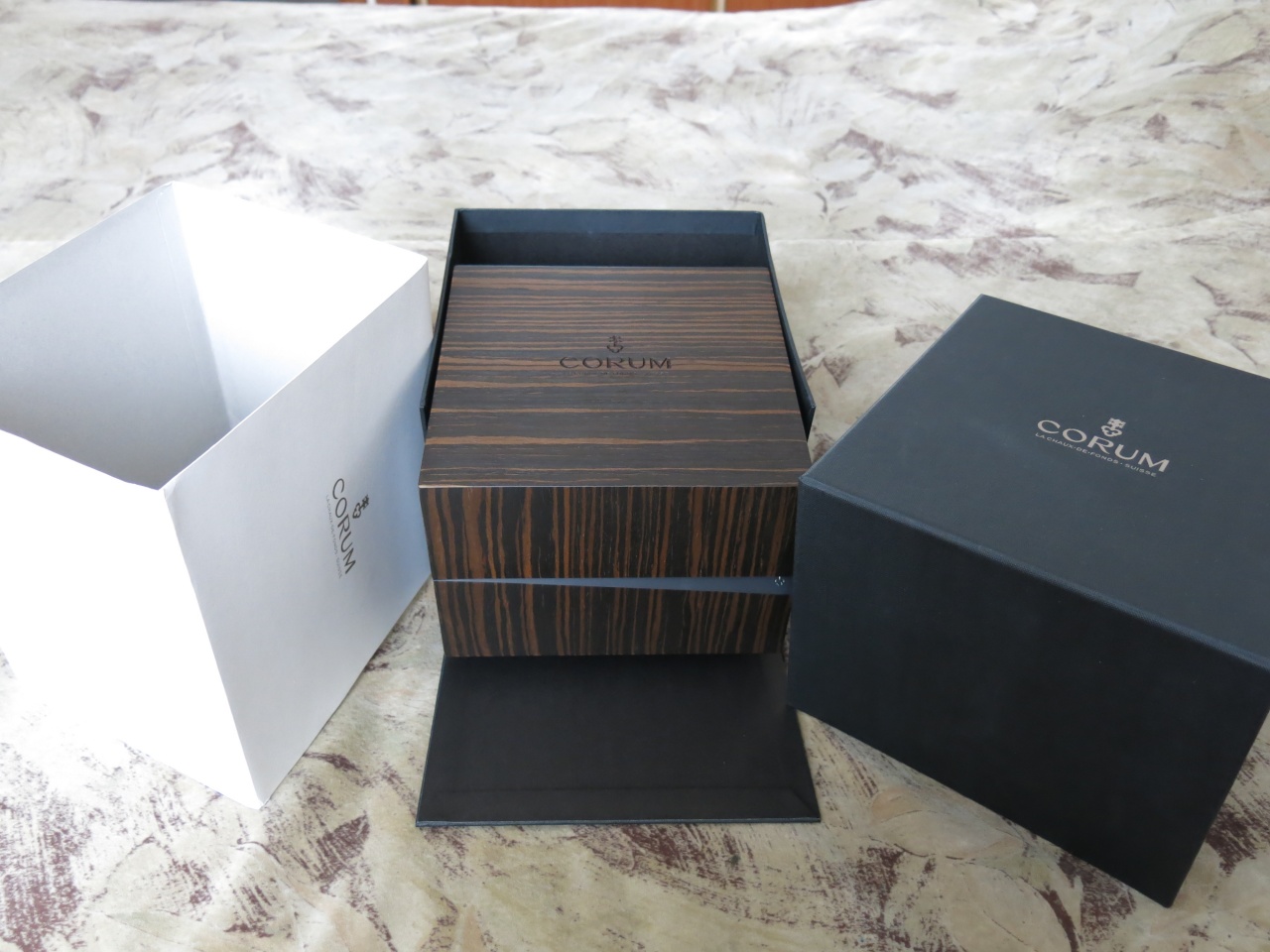 Полный комплект - Красивая коробка из красного дерева, черная транспортировочная коробка, часы в пленках, гарантийная карточка, сертификат, бирки, инструкции.