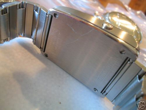Case: steel, brushed finish; trapezoid shape, 28 mm at the top x 32.5 mm at the bottom, 9.8 mm thick at the top x 13.1 mm thick at the bottom; display is slightly recessed into the case to provide better contrast for reading the numbers; push-button at 3 o'clock to turn on the display and change functions; button at 9 o'clock to set the time and date; back secured by 4 screws.