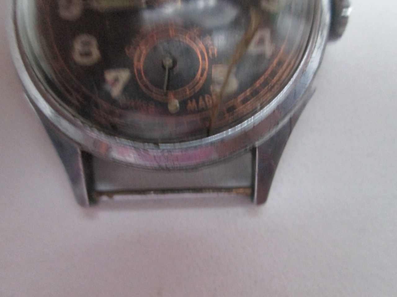 Циферблат, самое проблемное место, похоже, подкрашивался вручную, и это здорово видно - что наименование, что цифры, что разница в оттенке шкал и наименования. Шкалы по кругу не трогали, они выглядят лучше. Но, в целом, именно циферблат будет основным минусом при оценке состояния.