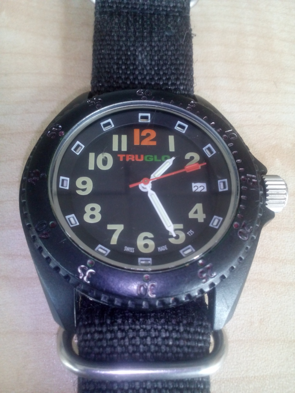 Очень редкие и лёгкие, кварцевые, тритиевая подсветка. 12 часов — оранжевая, 3,6,9 — синяя, остальное — зелёная. Стрелки — зелёный тритий. Секундная без трития (место под капсулу есть, но TruGlo почему-то не ставили на эту модель). Тритий в порядке, светит хорошо. Стекло минеральное, есть малозаметные некритичные царапки. Высококонтрастный циферблат. Установлен новый механизм Ronda 515, точность хода - убегают всего на 1-2 секунды в месяц.