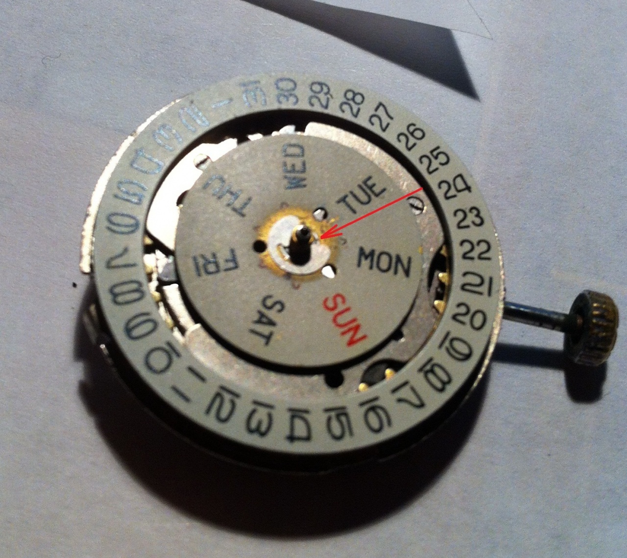 И вот в какой - то день меня осенило! Я заметил что сектор крутится великолепно и кнопка даты срабатывает когда зав. головка не закручена. В общем оказалось вот что , пластиковое кольцо крепления механизма стоит в корпусе с зазором больше чем следует и при закручивании зав. вал смещает кольцо вместе с механизмом к противоположной стенке корпуса. Вот поддавка перевода даты и зажималась и не могла переводить число . Вставил я резиновую прокладочку между кольцом и корпусом и УРА!!! Всё работает как надо и автоподзавод и кнопка даты . Виноват не механизм (он отлично и надёжно работает) а недоработка технологов. Следовало либо вал в подпружиненной головке делать короче, либо кольцо крепления механизма точнее по размеру...
