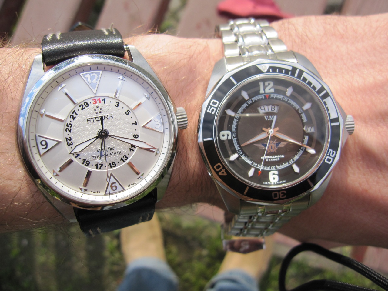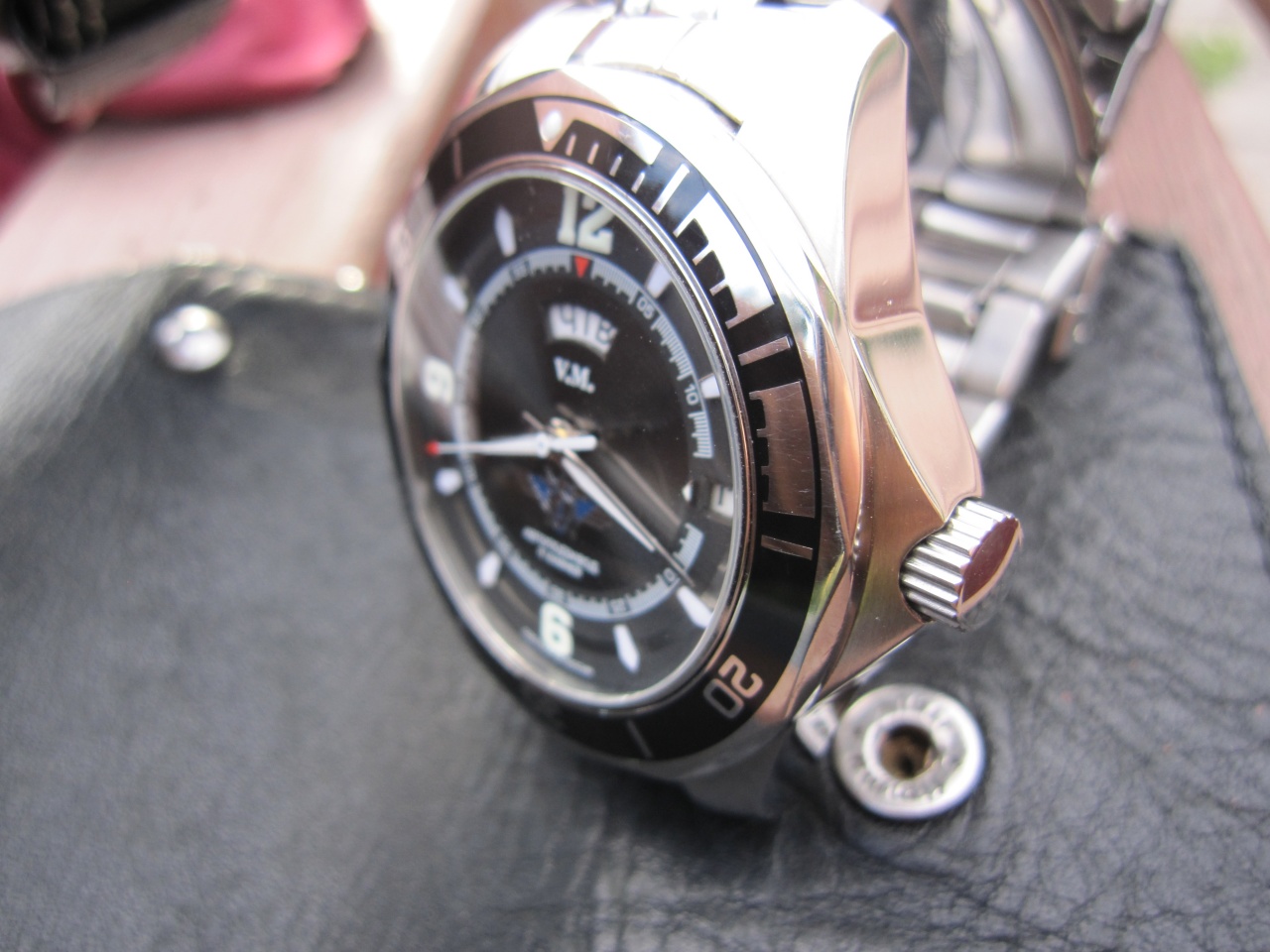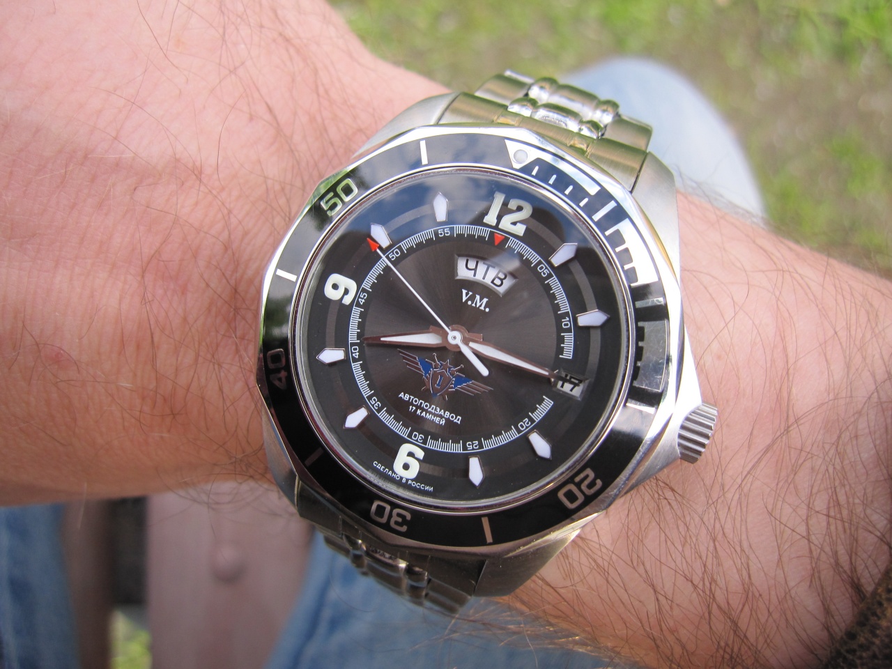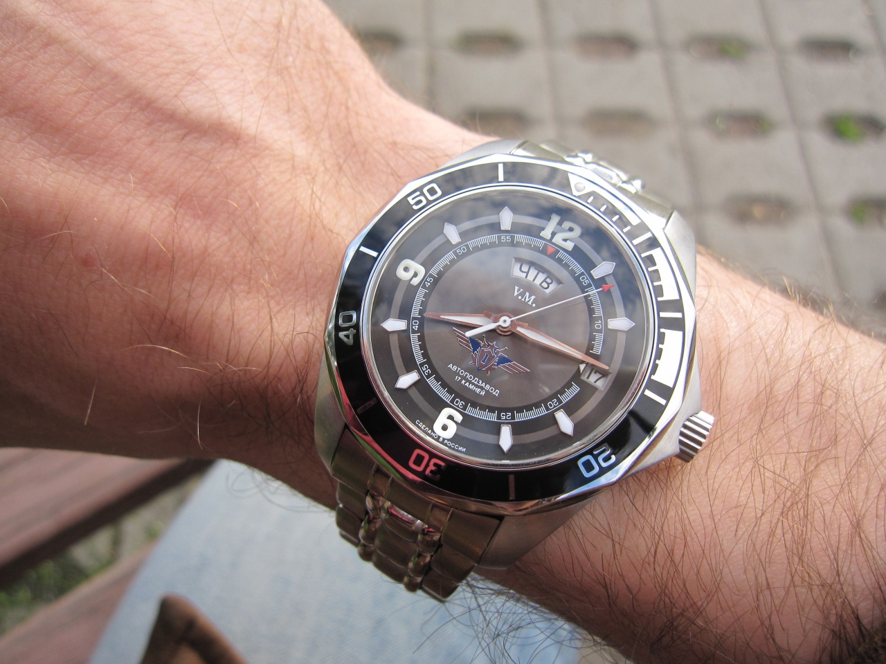 Теперь по часам... Дизайн мне очень нравится , красивый цифер и стрелки. Как по мне так лицо у часов просто ЛЮКС . Качество цифера на 10 с плюсом. Люблю их носить. Моё недоумение вызывает лишь 3 атм. при внешне дайверском корпусе. "Виновата" в этом кнопка перевода даты, она сделана достаточно герметично но давление выше 3-4 атм не держит. Эх, без неё часы спокойно выдерживали бы 10 атм. Ну что ещё... люминофор приличный, на ночь хватает, но не Этерна конечно