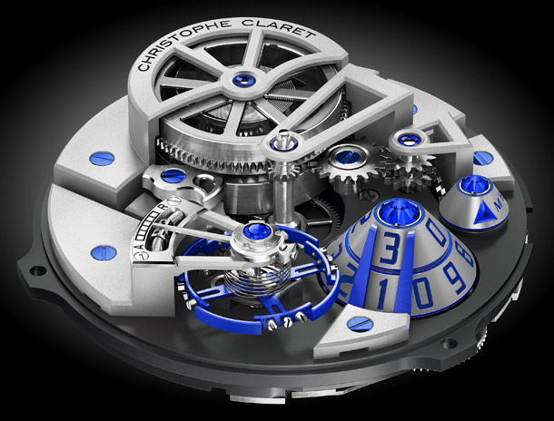 Компания Christophe Claret обладает характером настоящего нонконформиста, который никогда не упускает возможности выразить смелость и креативность с помощью создания оригинальных указателей, противоречащих традиционным канонам дизайна. Просто взгляните на большой указатель даты, который часовой мастер так ловко поместил у отметки «5 часов». Запатентованный большой указатель даты состоит из двух конусообразных алюминиевых дисков: верхний диск – для десятков, нижний – для единиц. Смена показаний механизма даты происходит после полуночи всего за 20 минут. И в качестве идеального завершающего штриха на верхнюю часть устанавливается натуральный рубин или натуральный сапфир.