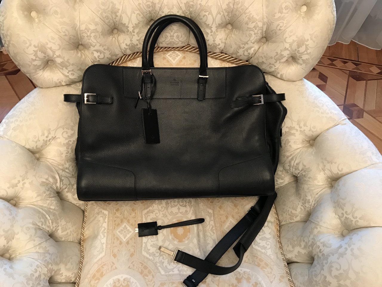 Сумка для путешествий Gucci, летала один раз из Парижа, там и была куплена. Состояние идеальное, шикарная телячья кожа, есть ремень. 75 тыс.