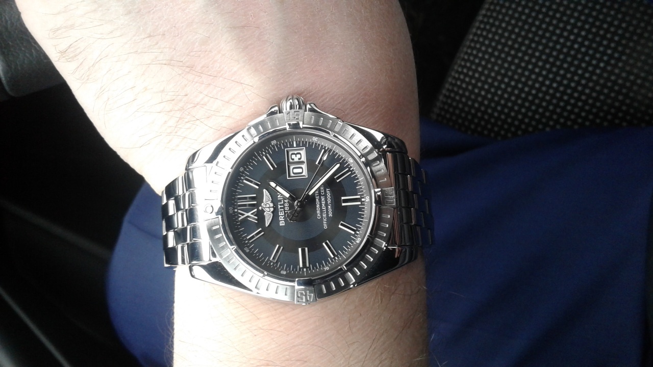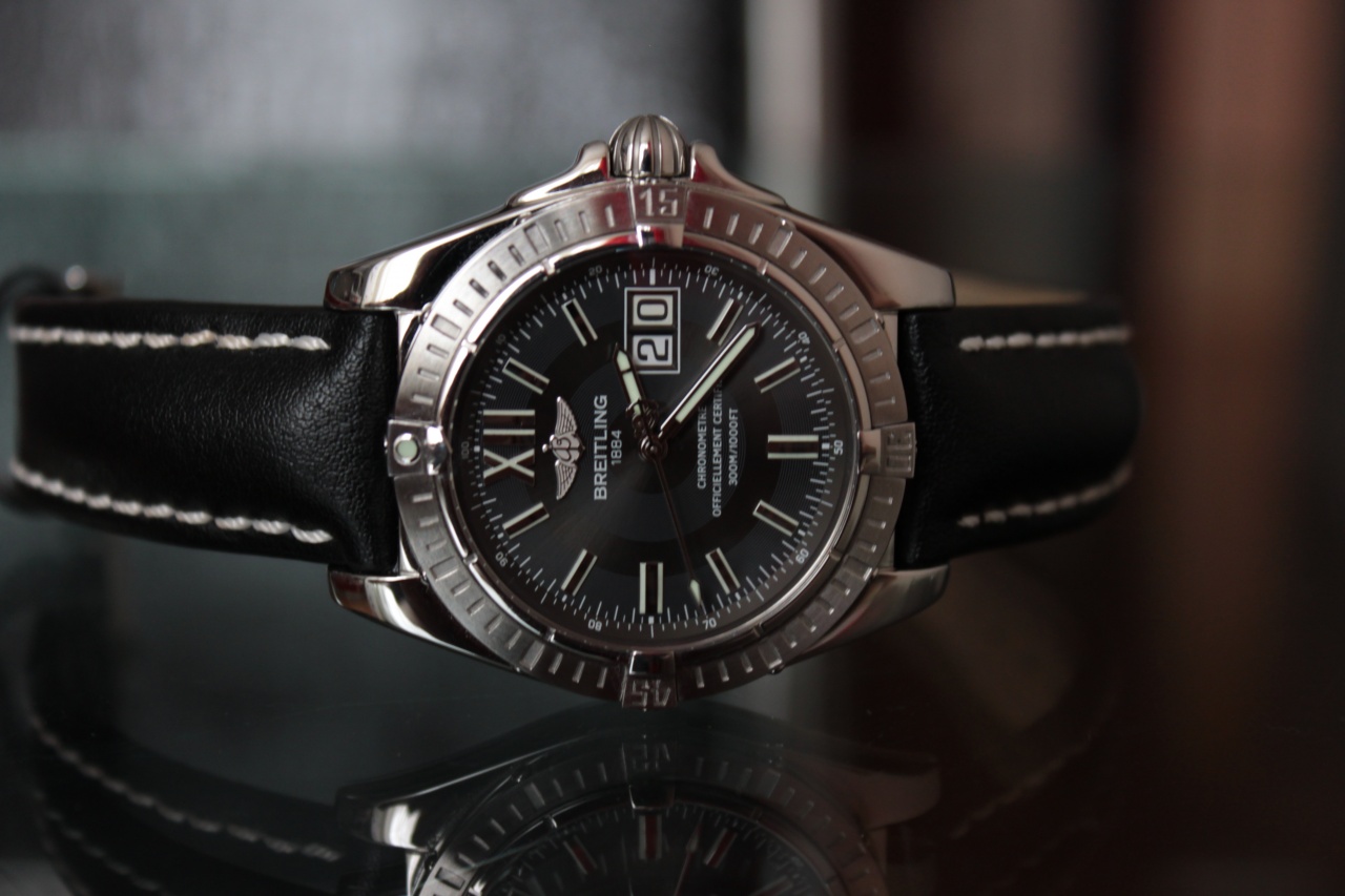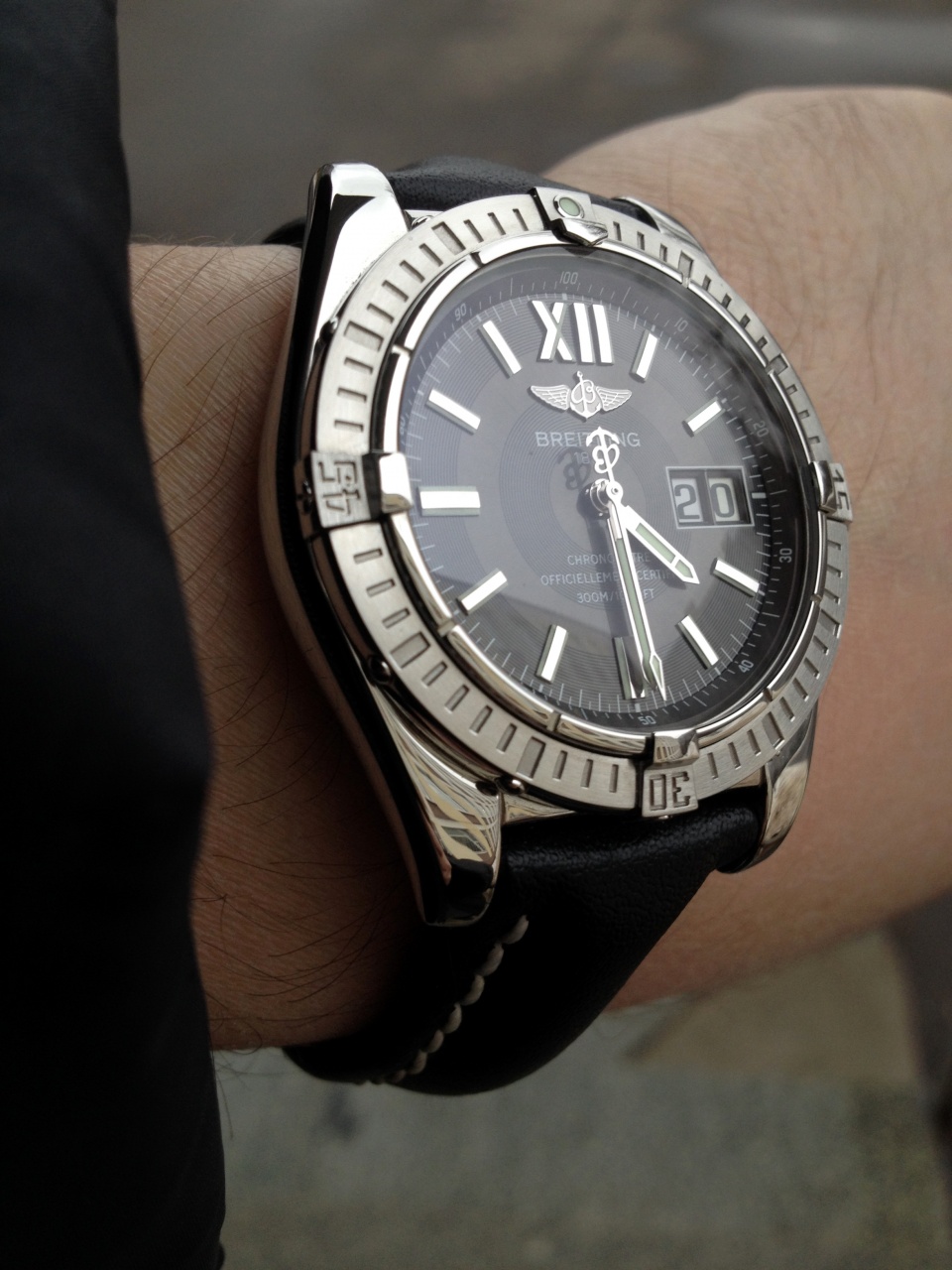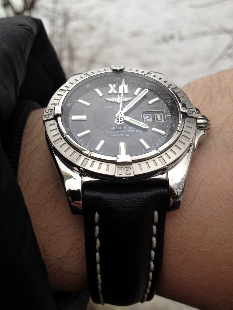 Циферблат серый (gray). В зависимости от освещения меняет цвет от светло-серого до темно-коричневого. Ремень новый, HIRSCH Heavy Calf с оригинальной застежкой Breitling.