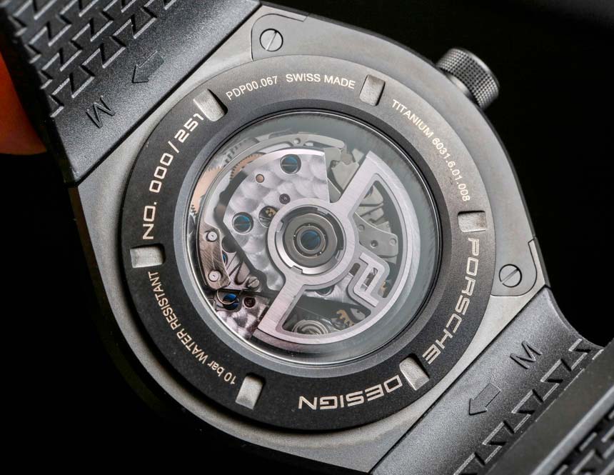 Новые часы Porsche Design Monobloc Actuator Chronograph работают на швейцарском часовом механизме Valjoux 7754 с узнаваемой системой Valjoux 12-9-6. На выбор предлагается несколько различных оформлений циферблата и цвета корпуса. Есть также ограниченная серия Porsche Design Monobloc Actuator 24H Chronotimer в титановом корпусе с покрытием из карбида титана и циферблатом из углеродного волокна. Также доступны модификации с матовым черным циферблатом, с черным циферблатом с покрытием от солнечных бликов и синим циферблатом. Задняя крышка из сапфира, поэтому сквозь нее можно наблюдать за работой механизма Valjoux 7754. Часы будут поставляться с полностью титановым браслетом или резиновым ремешком. Оба варианта удобны в ношении, но титановый вариант выглядит солиднее.